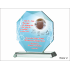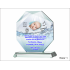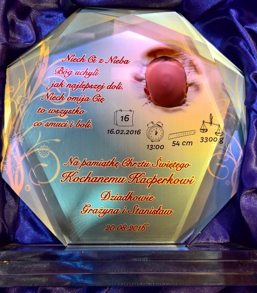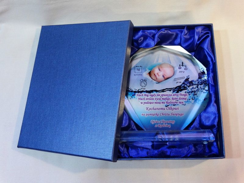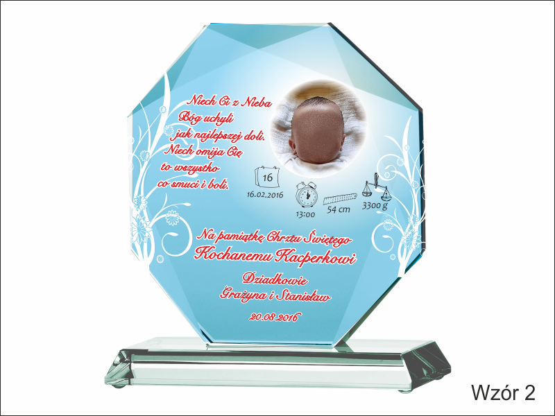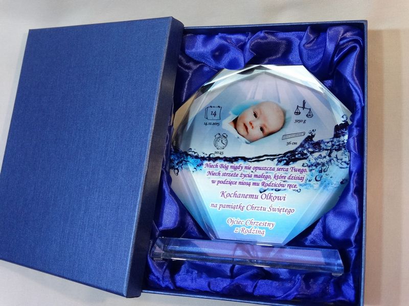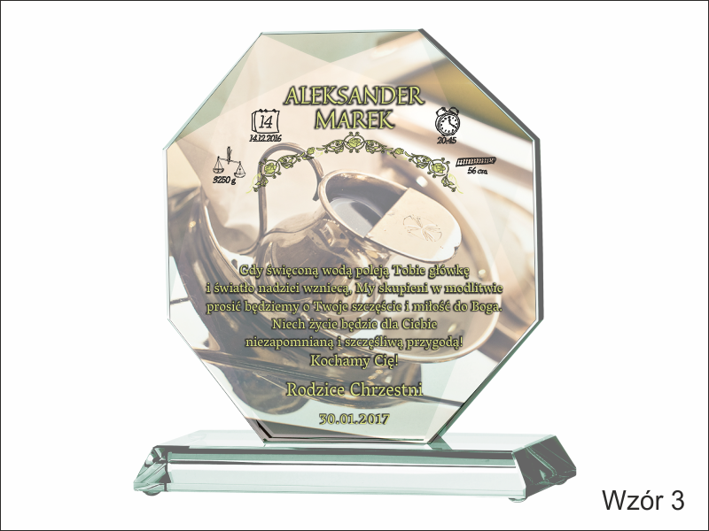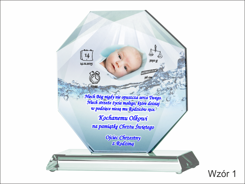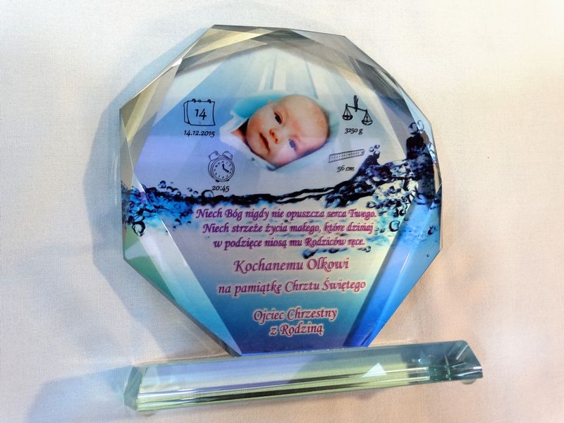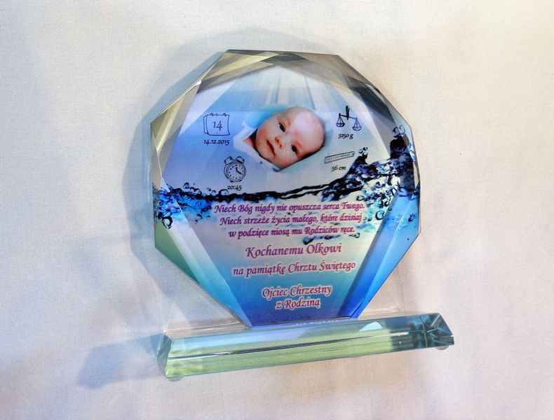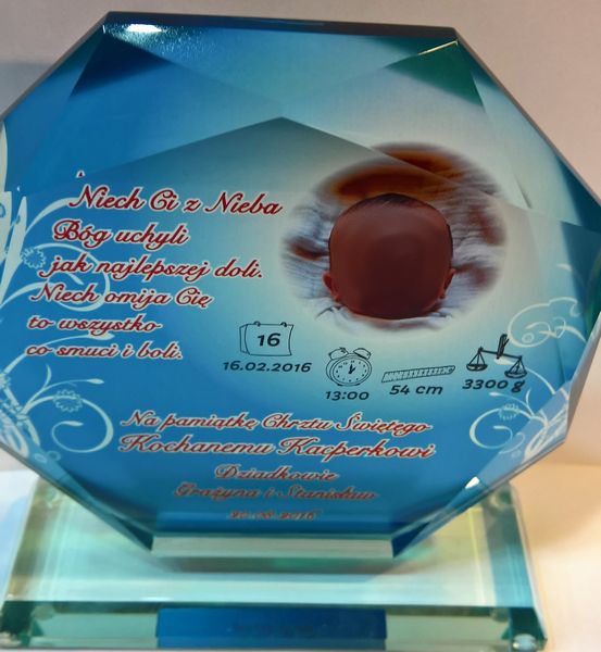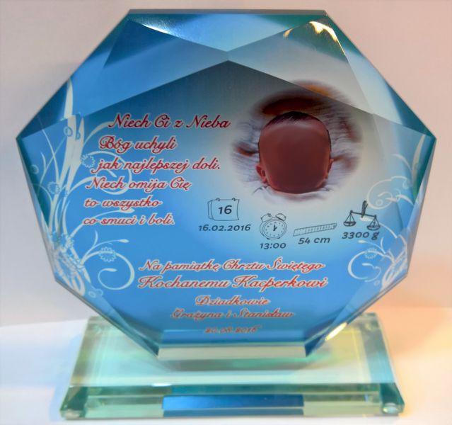 Statuetka szklana z grubego szkła w kształcie szlifowanego ośmioboku z nadrukiem dedykacji i ozdobnych grafik z okazji Chrztu Świętego.