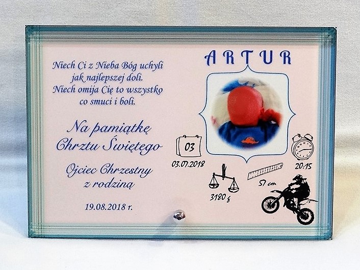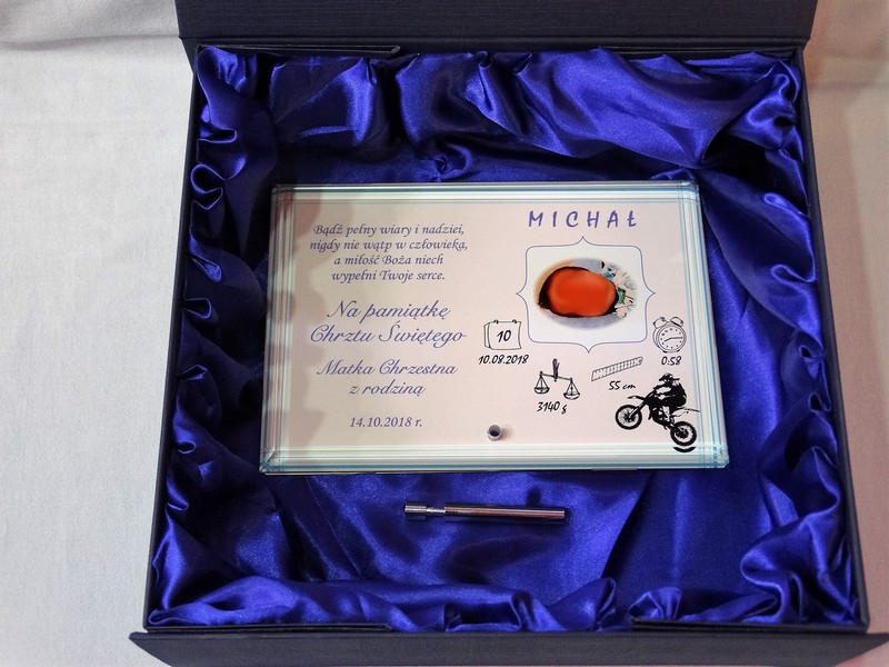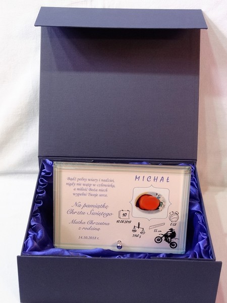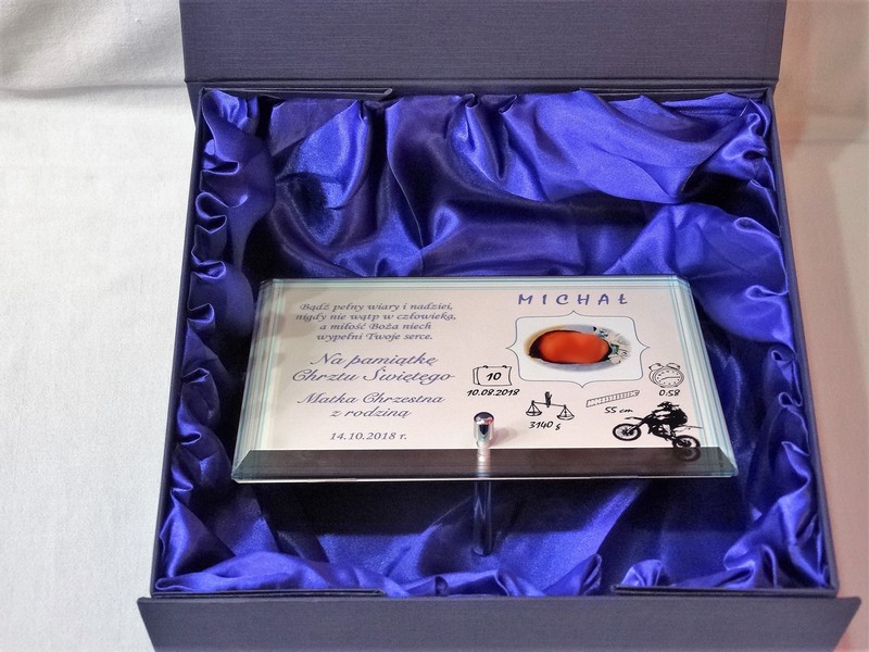 Statuetka szklana z grubego szkła w prostokątnym poziomym kształcie z nadrukiem dedykacji i ozdobnych grafik z okazji Chrztu Świętego.