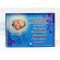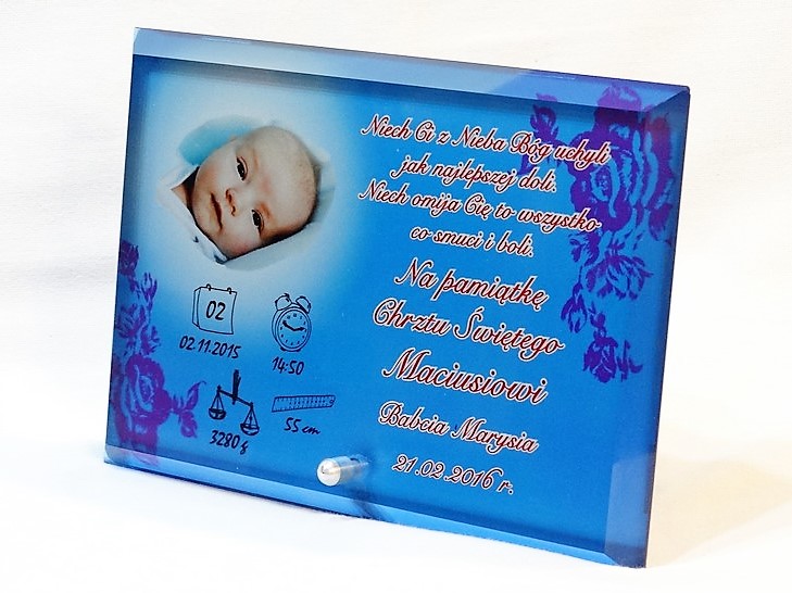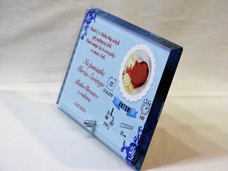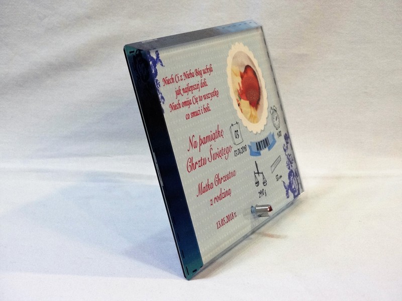 Statuetka szklana z grubego szkła w prostokątnym poziomym kształcie z nadrukiem dedykacji i ozdobnych grafik z okazji Chrztu Świętego.