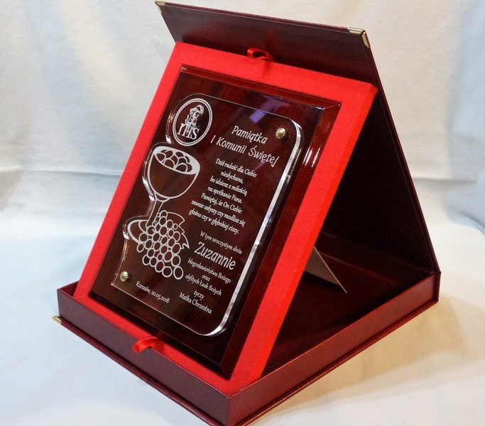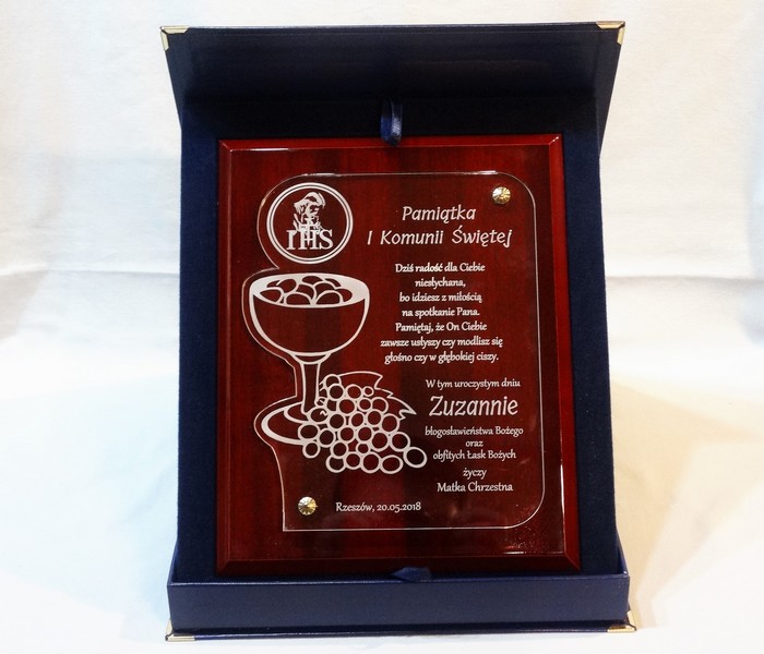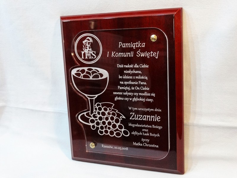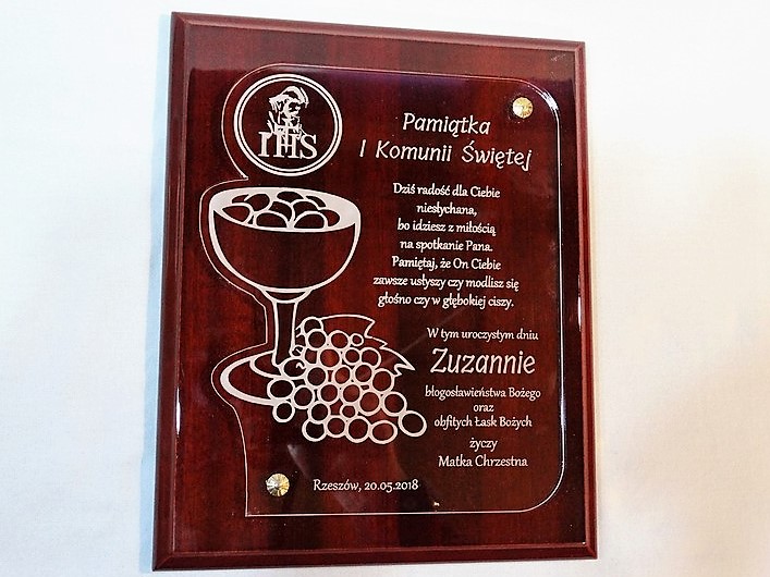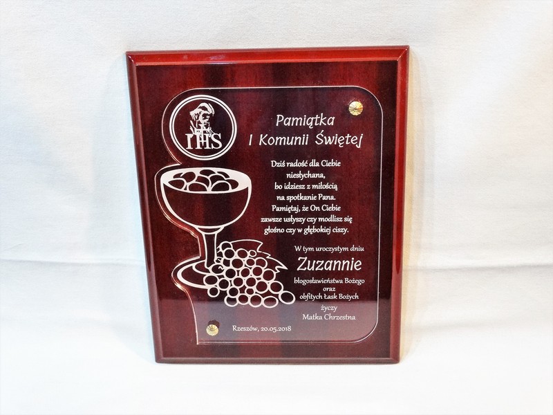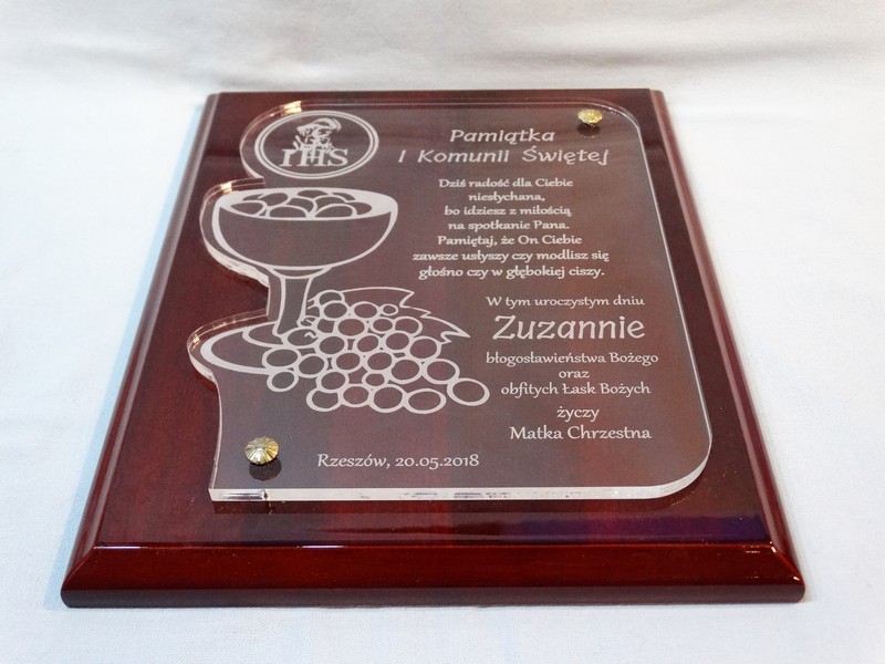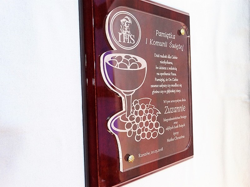 Pamiątka z okazji I Komunii Św. w postaci wyjątkowego grawerowanego akrylowego dyplomu okolicznościowego na lakierowanym podkładzie drewnianym.