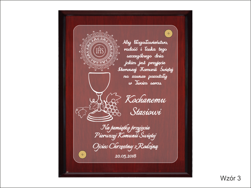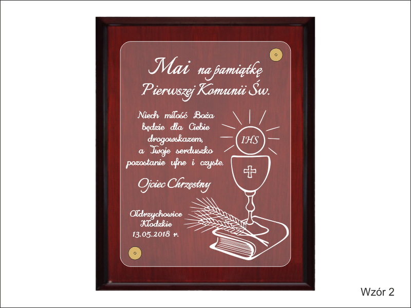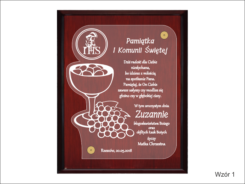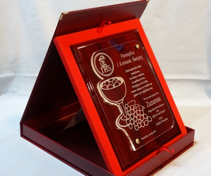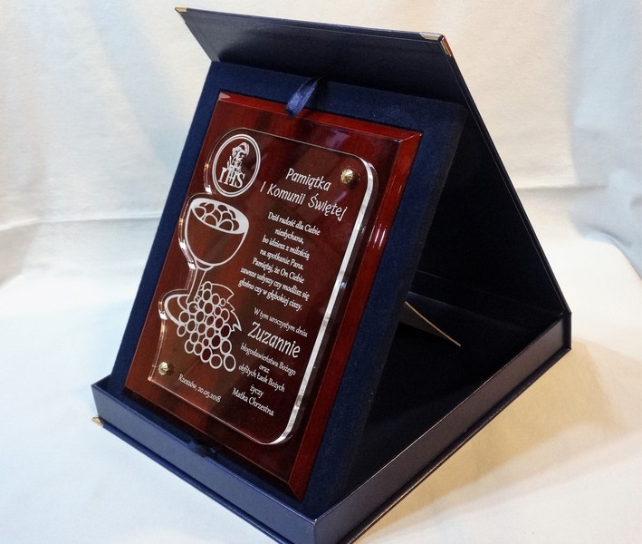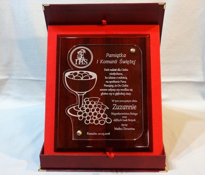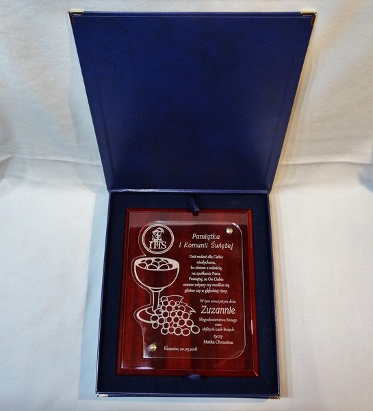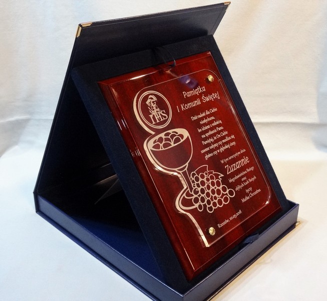 Pamiątka z okazji I Komunii Św. w postaci wyjątkowego grawerowanego akrylowego dyplomu okolicznościowego na lakierowanym podkładzie drewnianym.
