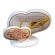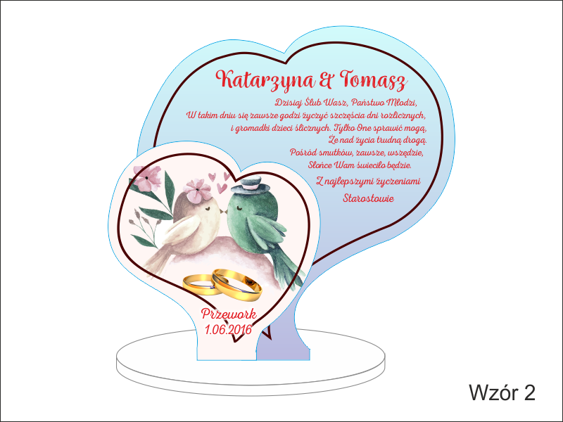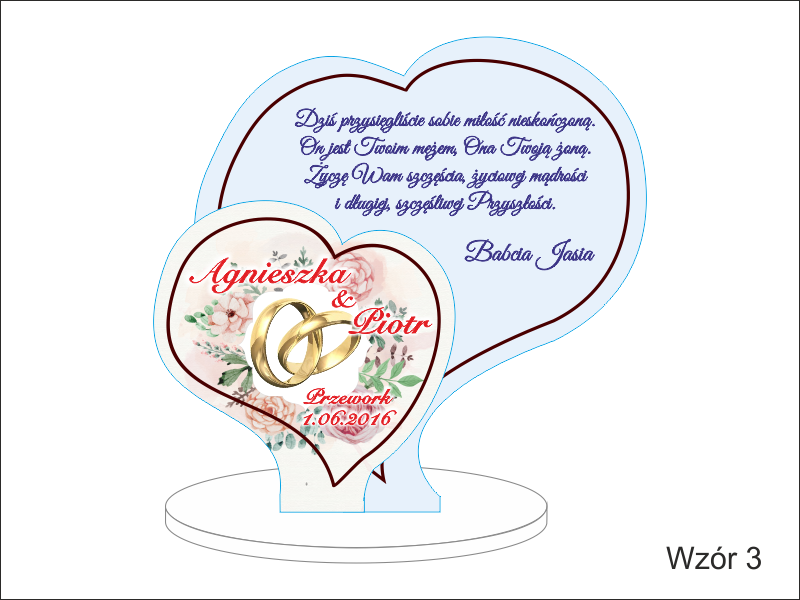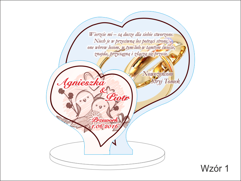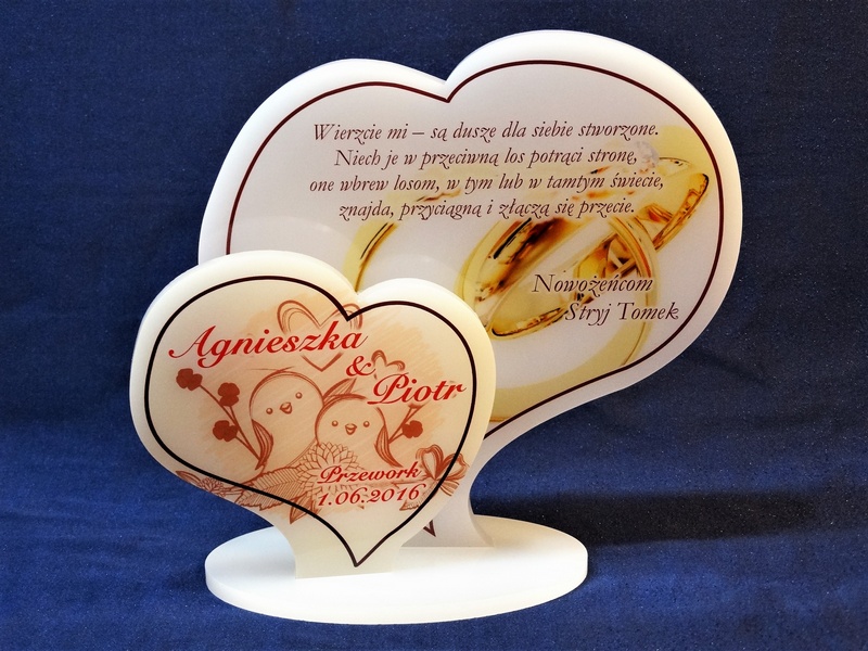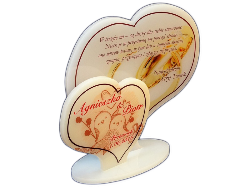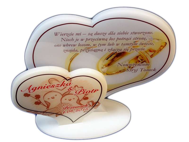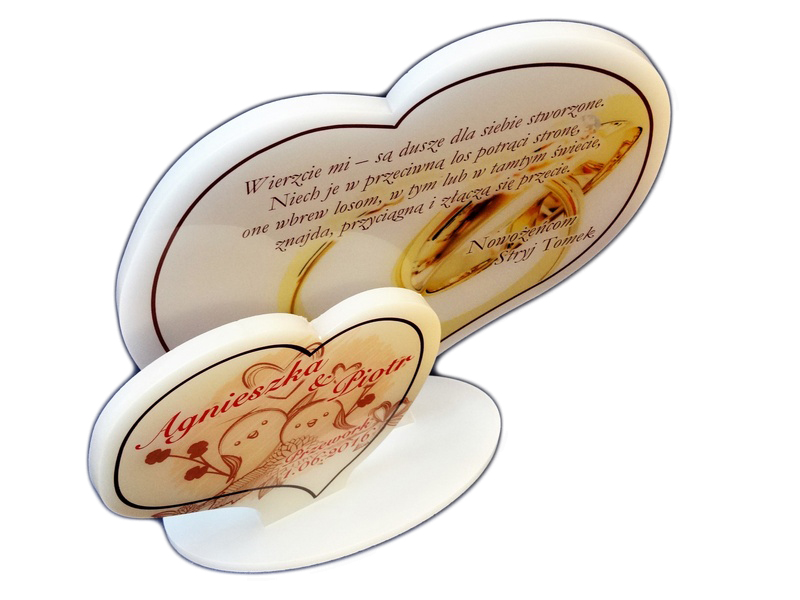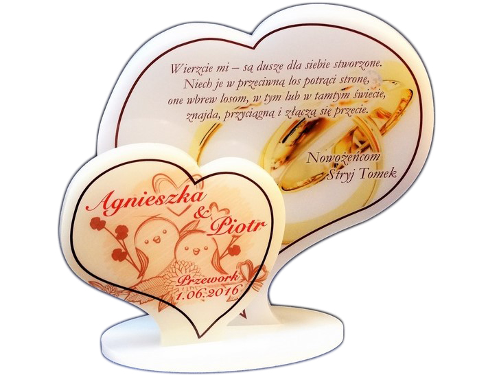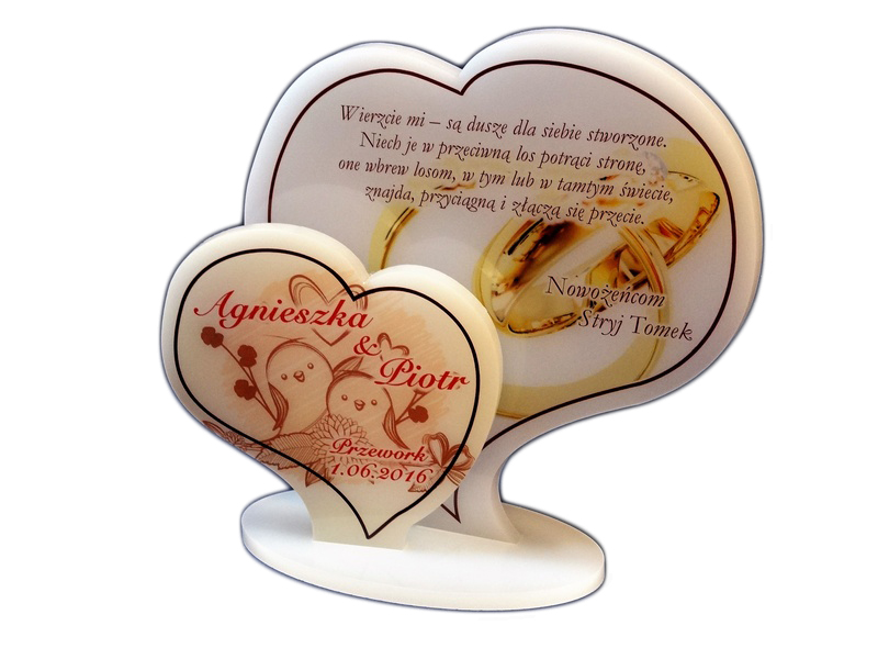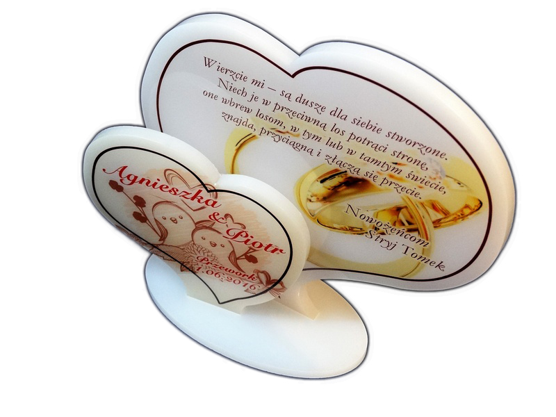 Statuetka wykonana z pleksi mlecznej w kształcie dwóch osobnych serc z nadrukiem dedykacji na pamiątkę ślubu.