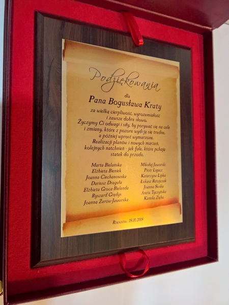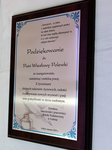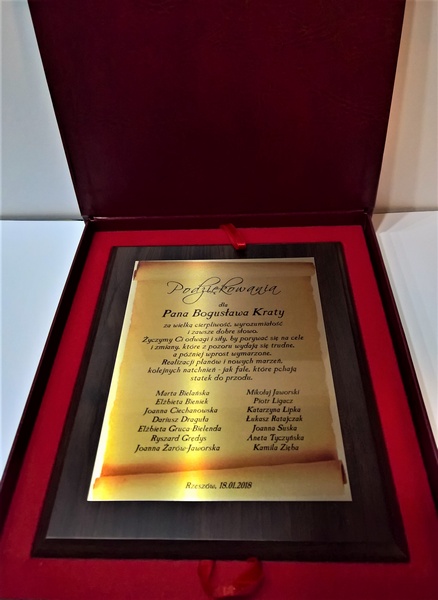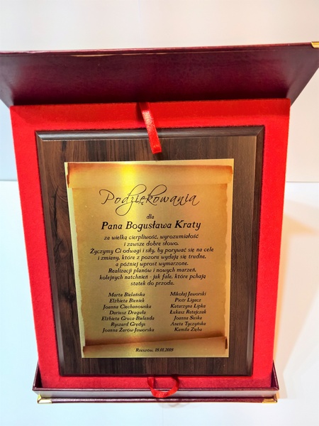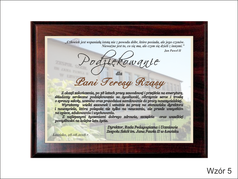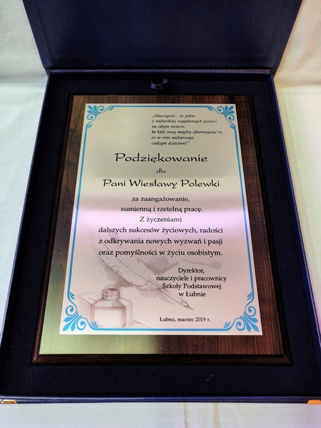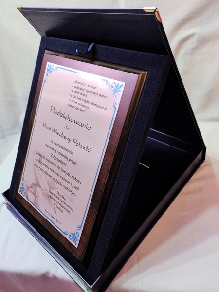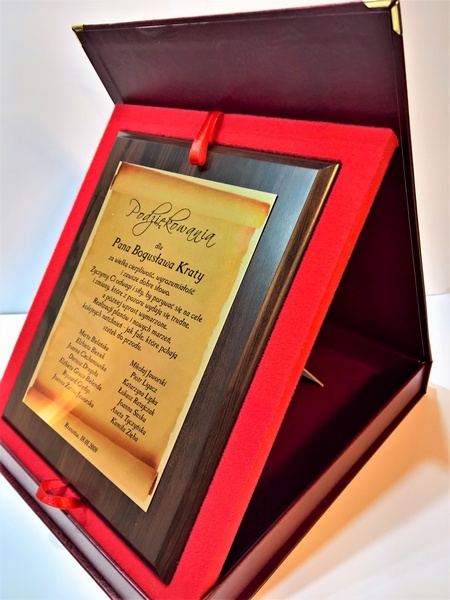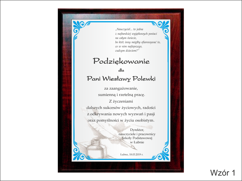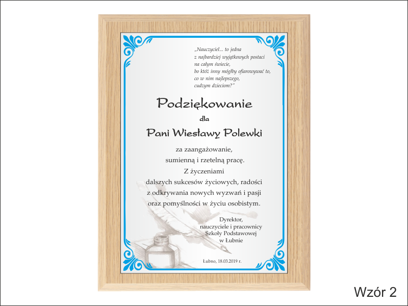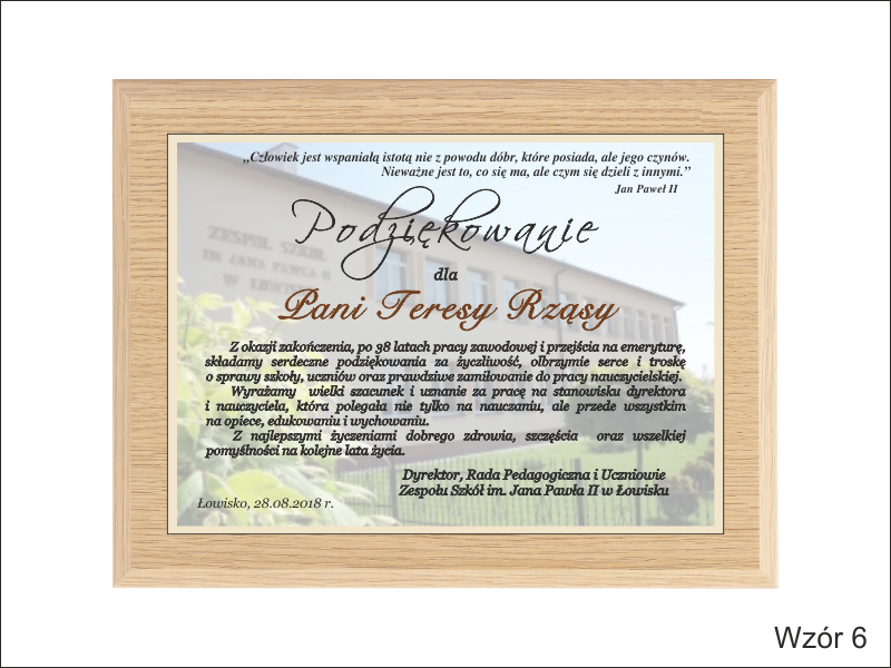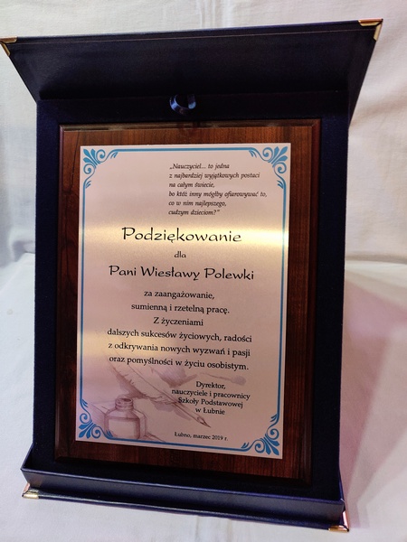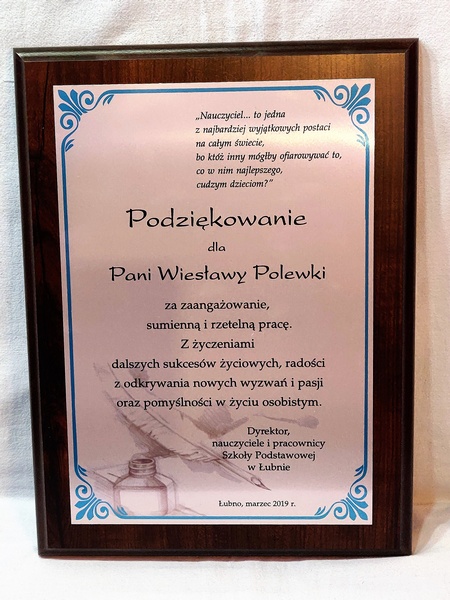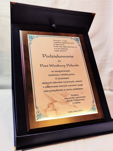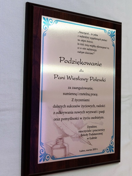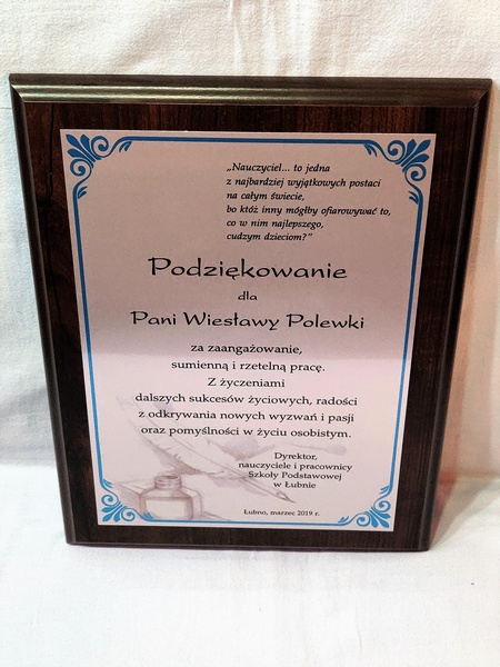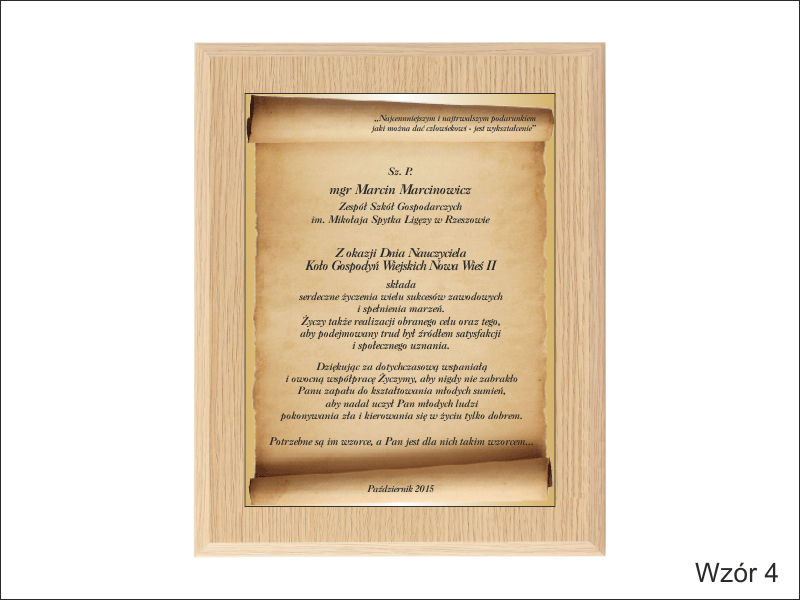 Pamiątka z podziękowaniem dla Nauczyciela w postaci dyplomu drewnianego składający się z blachy z nadrukiem i podkładu.