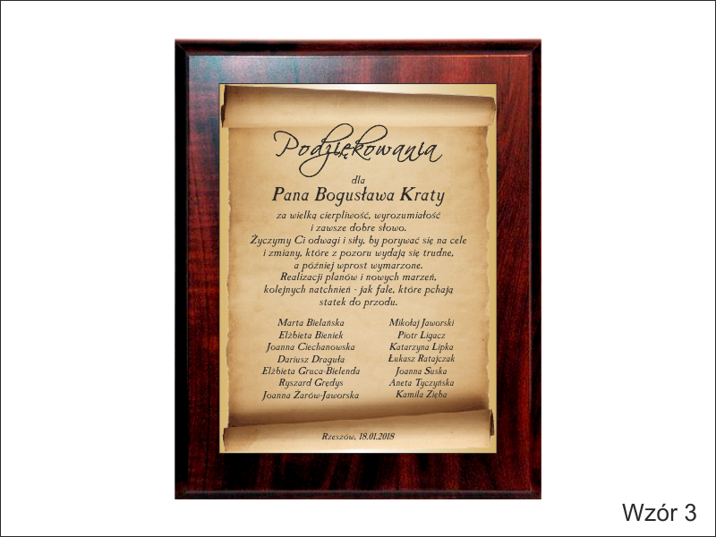 Istnieje możliwość wykonania dedykacji wg indywidualnych ustaleń i projektu uzgodnionego z klientem lub wg jednego z wzorów.