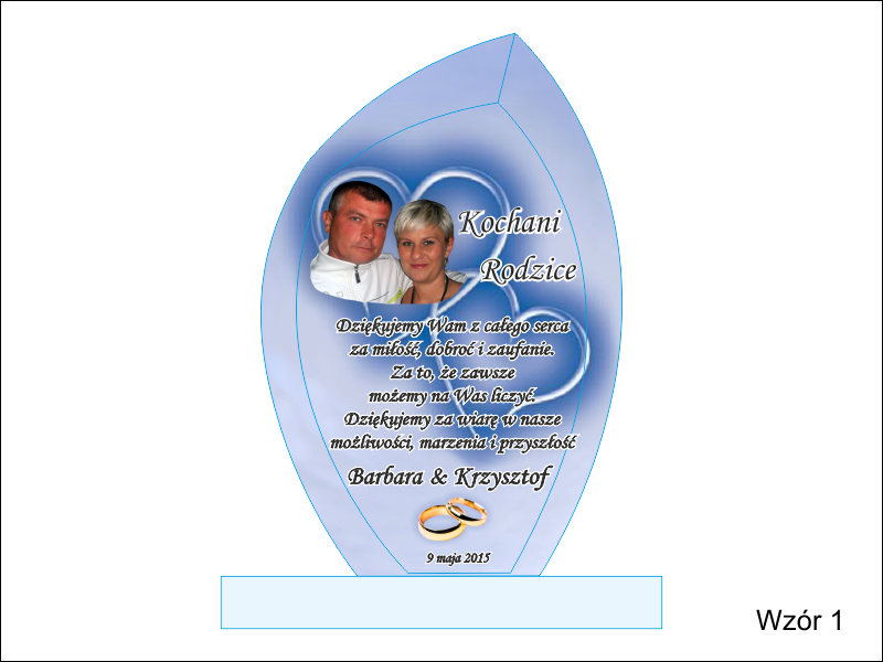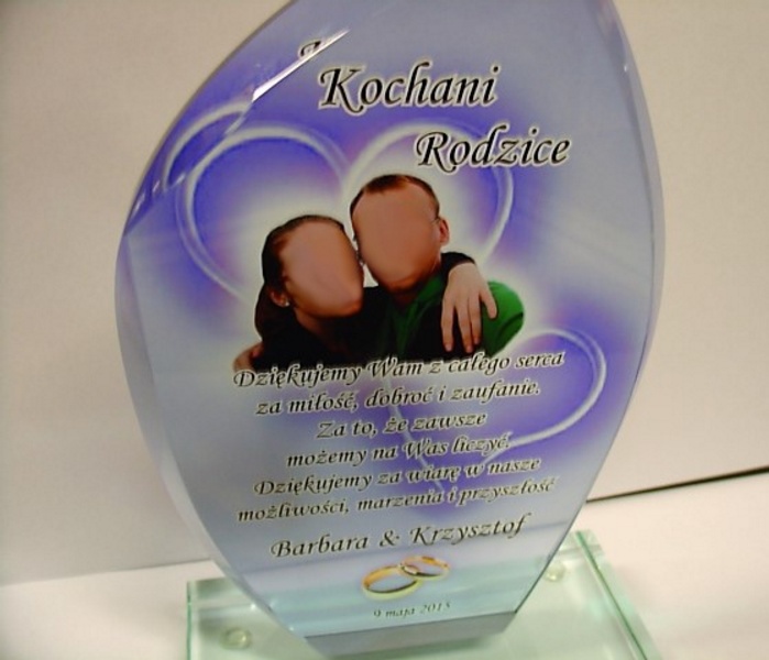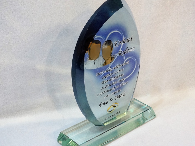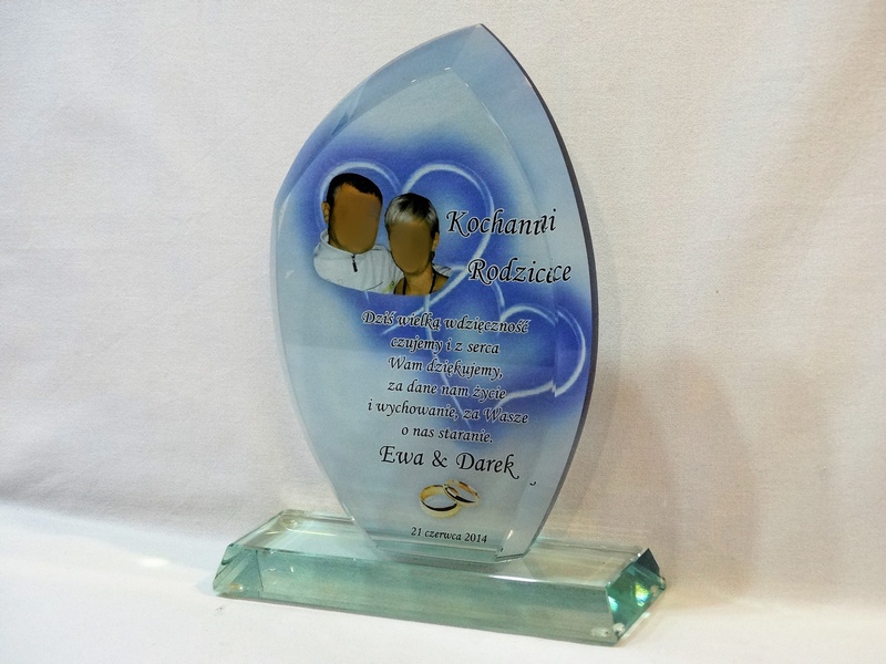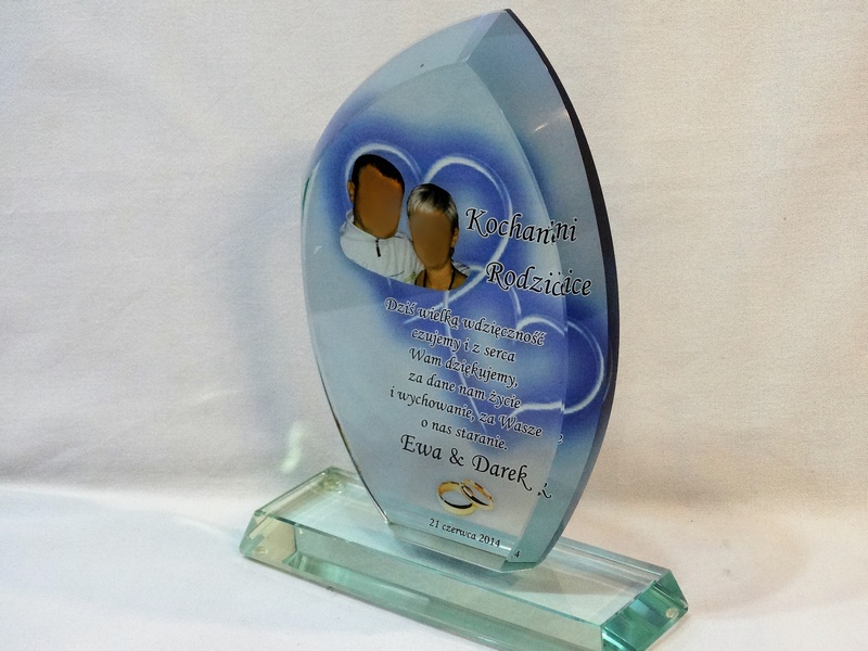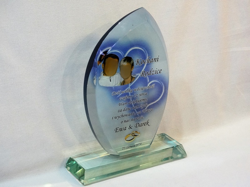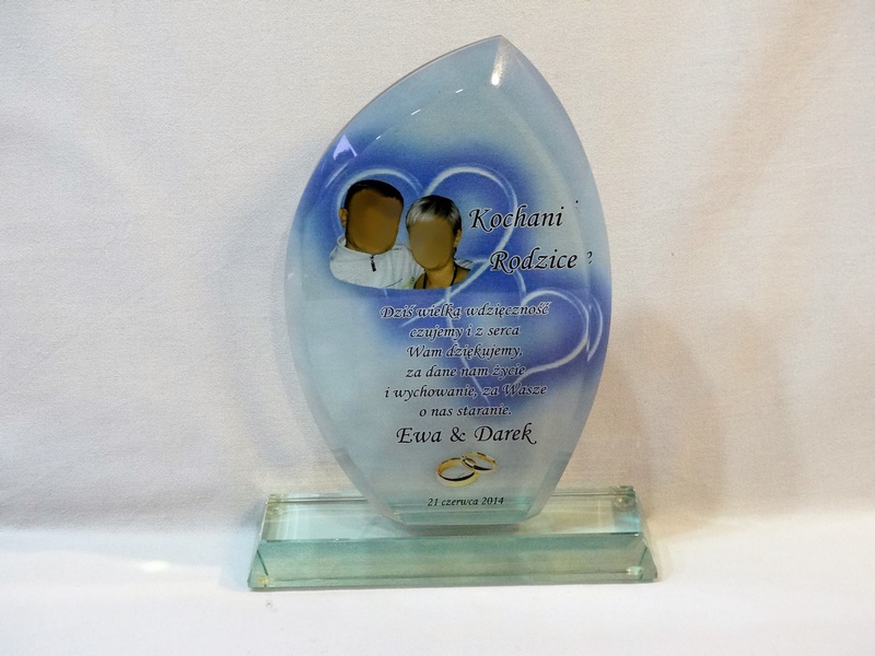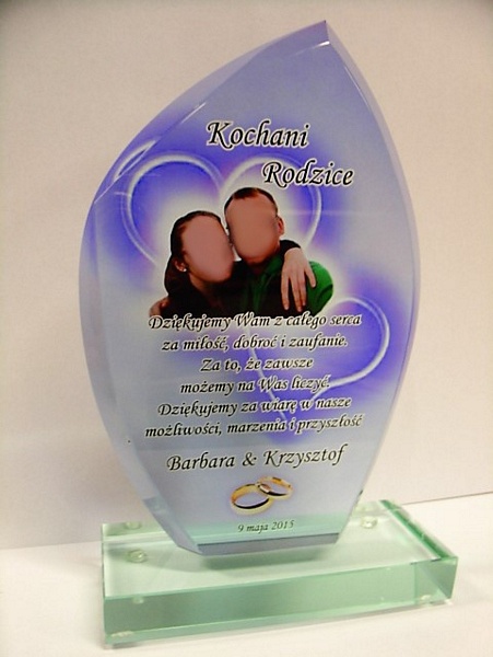 Pamiątkę z nadrukiem dla rodziców można także wykonać na innych modelach statuetek szklanych.