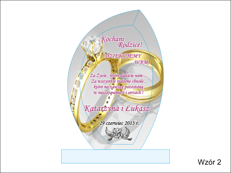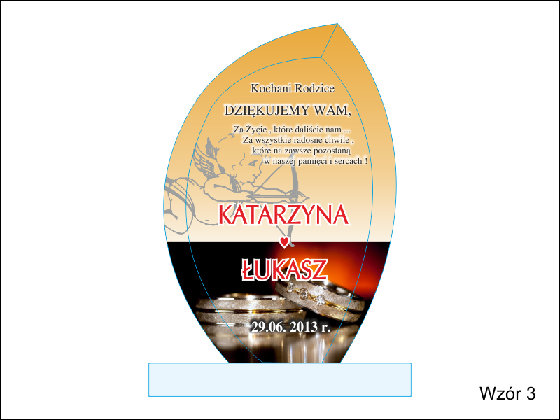 Na statuetce wykonany jest nadruk ozdobnych grafik i dedykacji z podziękowaniem dla rodziców na pamiątkę ślubu.