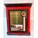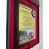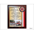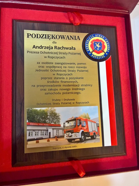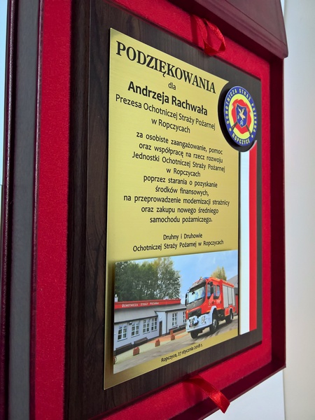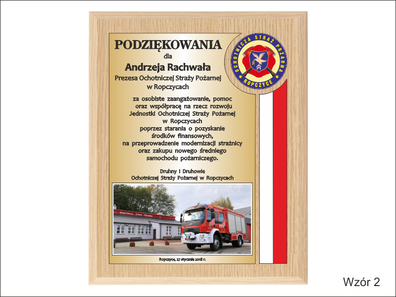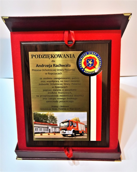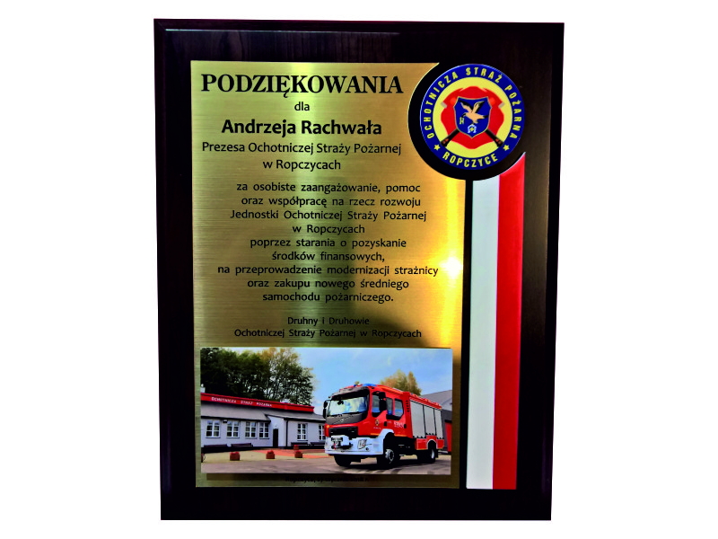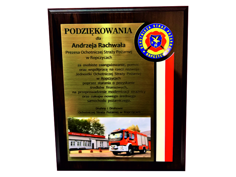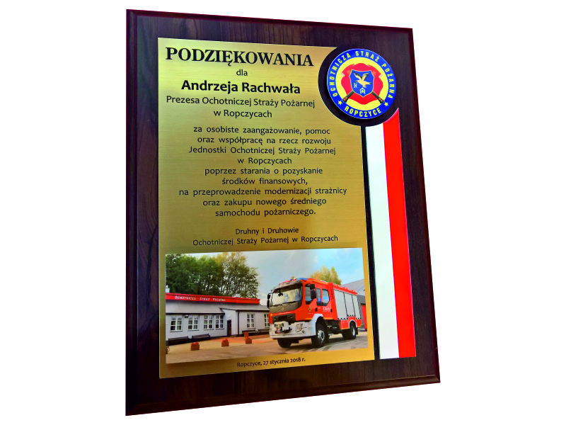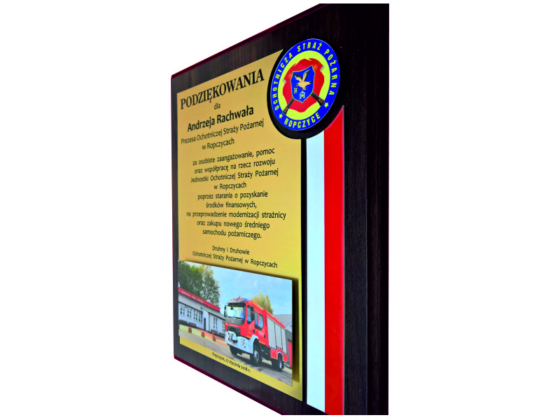 Podziękowanie od strażaków za służbę, pracę i zaangażowanie w postaci pamiątkowego dyplomu okolicznościowego na drewnianym podkładzie.
