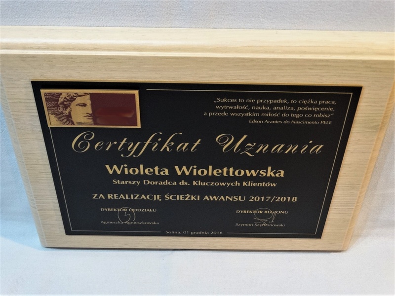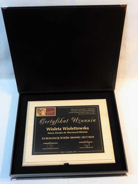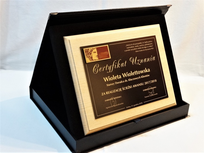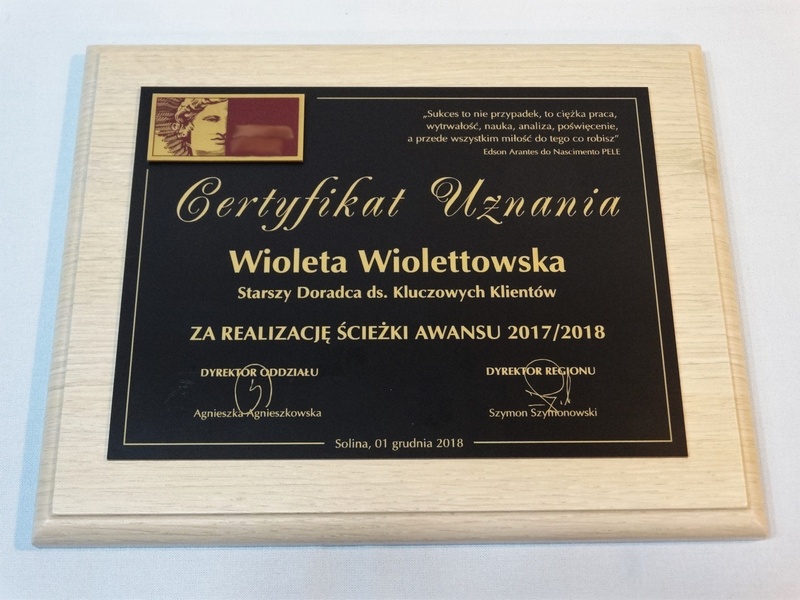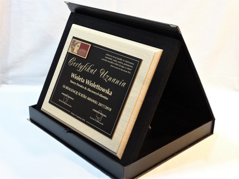 Certyfikat uznania za pracę w formie złożonego dyplomu okolicznościowego na lakierowanym drewnianym podkładzie, składający się: