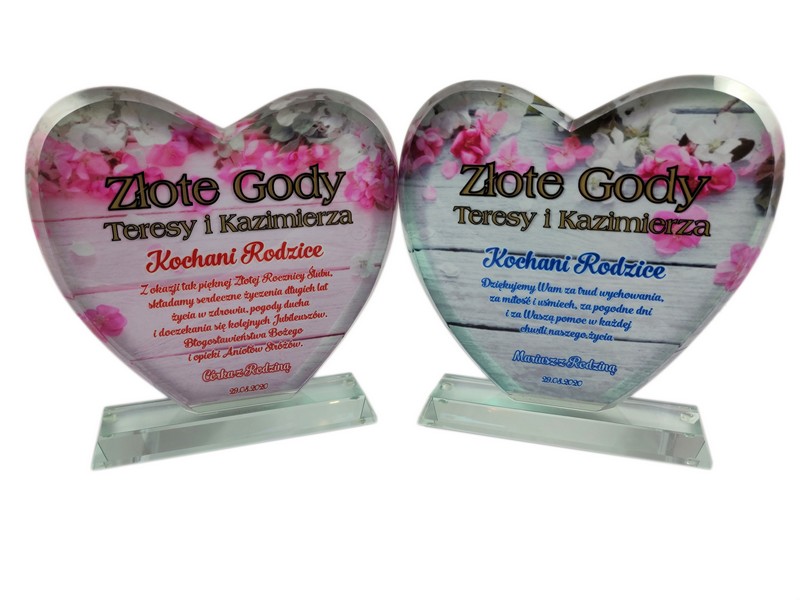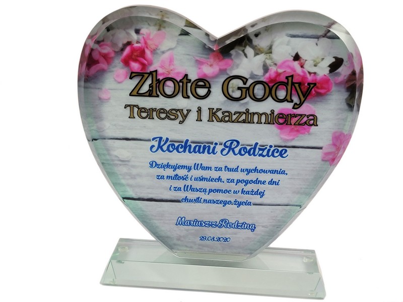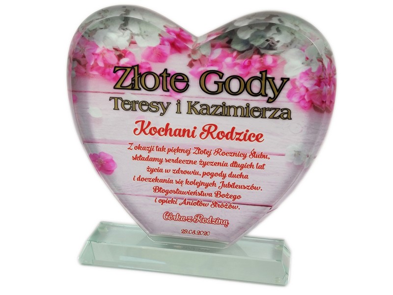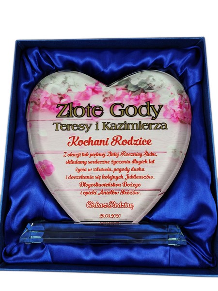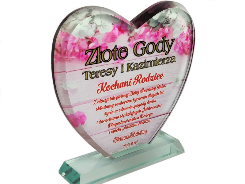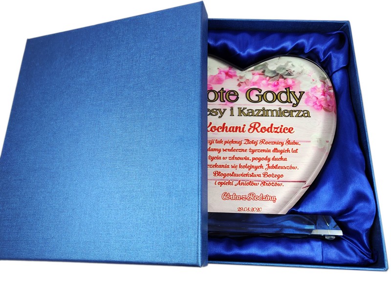 Prezent z okazji Rocznicy Ślubu w postaci pamiątkowej statuetki szklanej w kształcie serca z nadrukiem dedykacji.