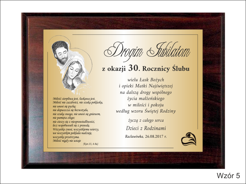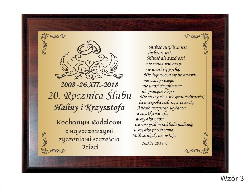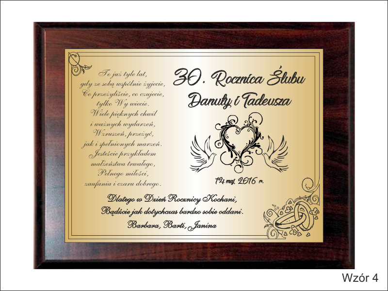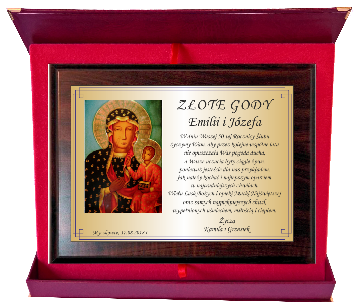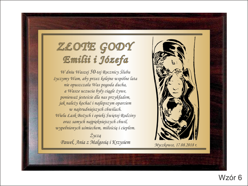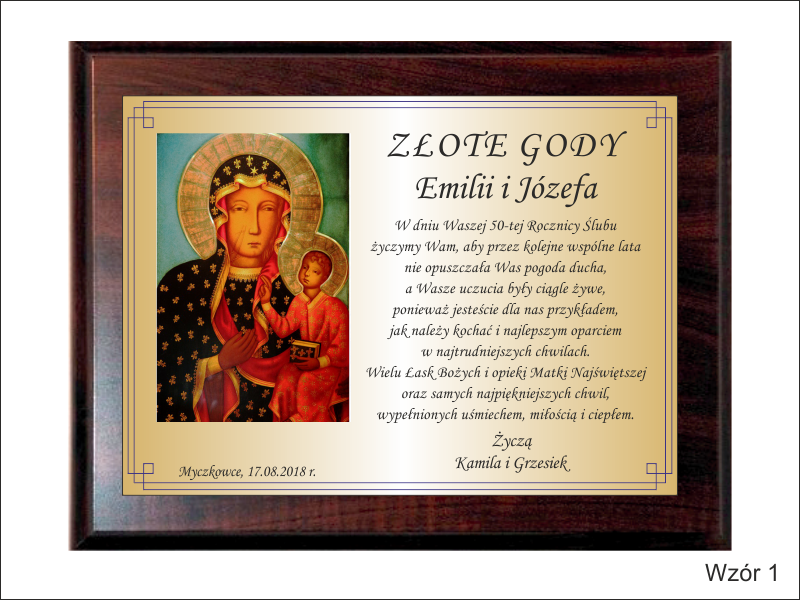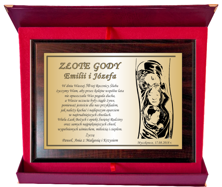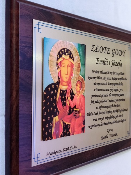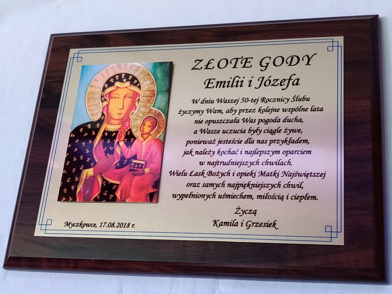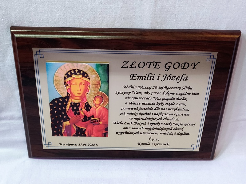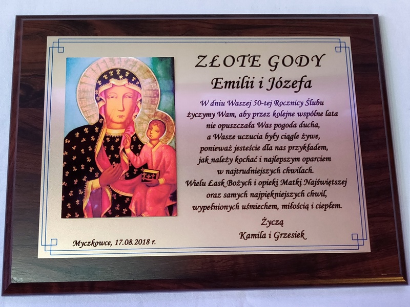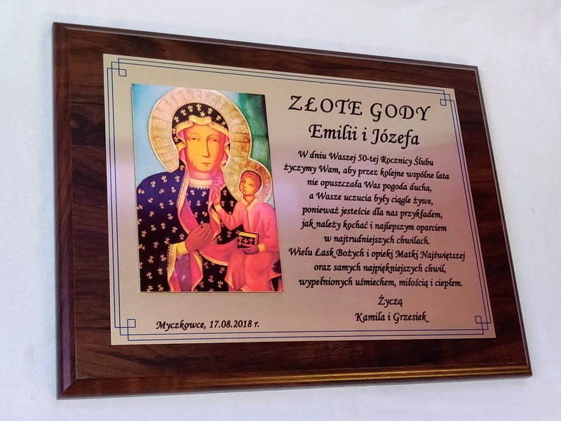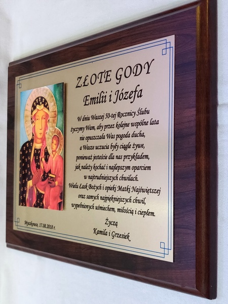Dedykacja, grafiki, zdjęcia oraz ozdobniki nadrukowane są.na złotej blaszce lub grawerowane w laminacie.