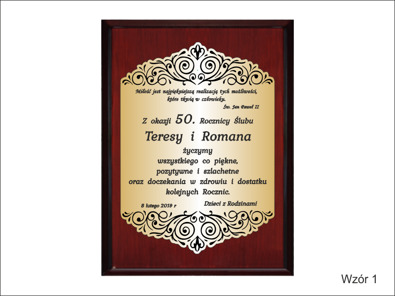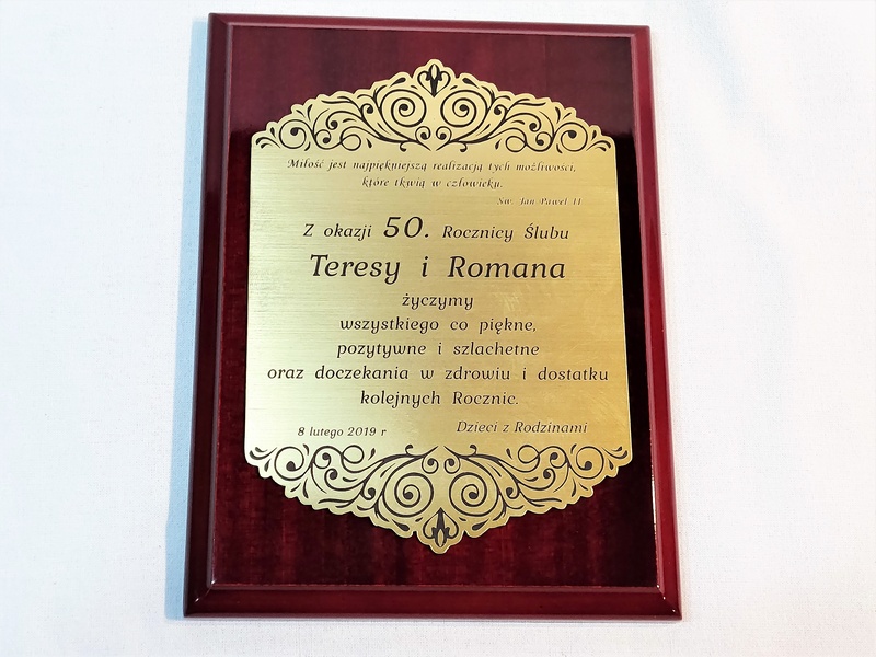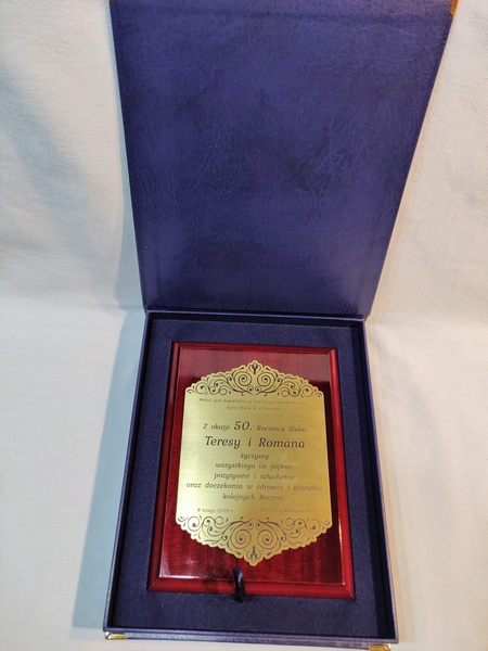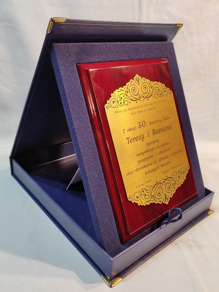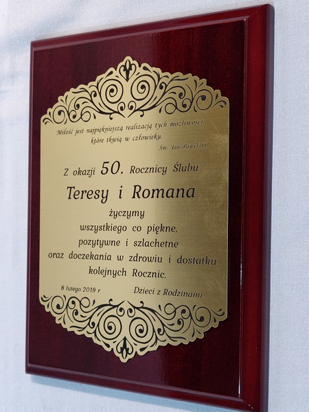 Pamiątka z okazji Rocznicy Ślubu w postaci dyplomu okolicznościowego na drewnianym lakierowanym podkładzie.