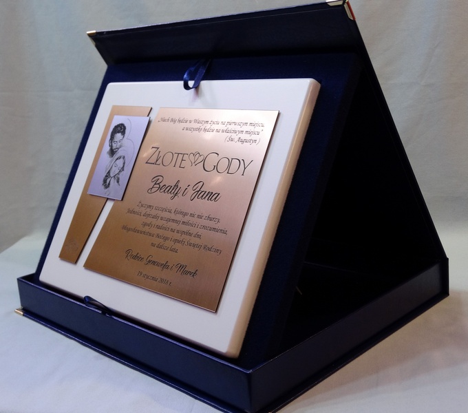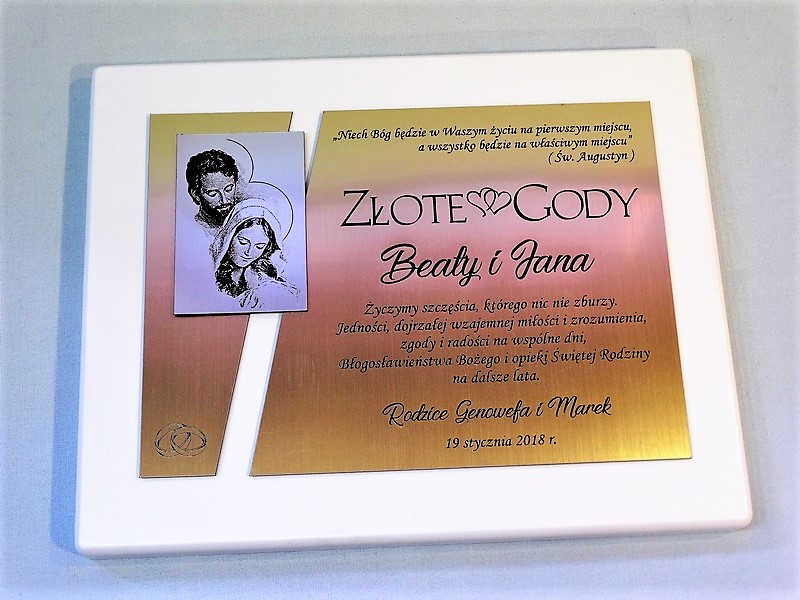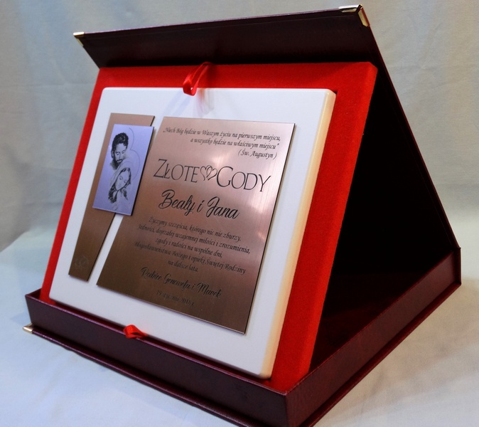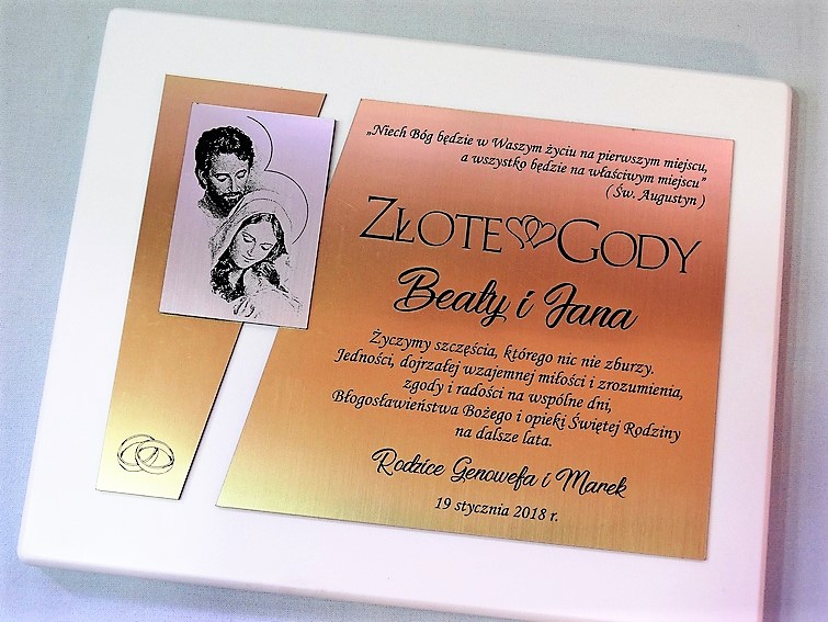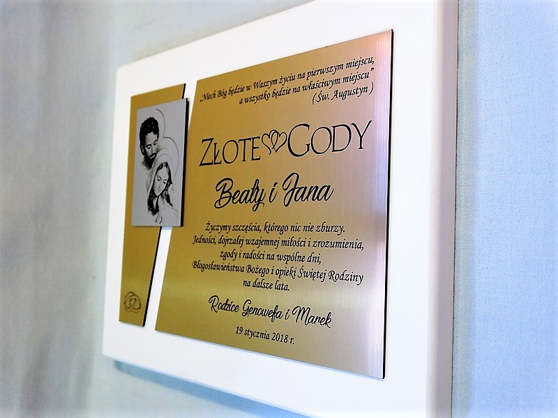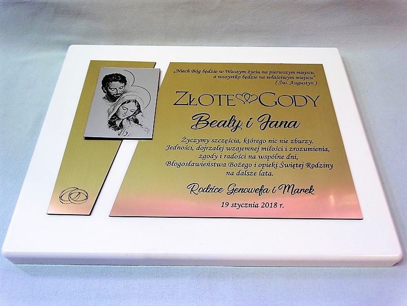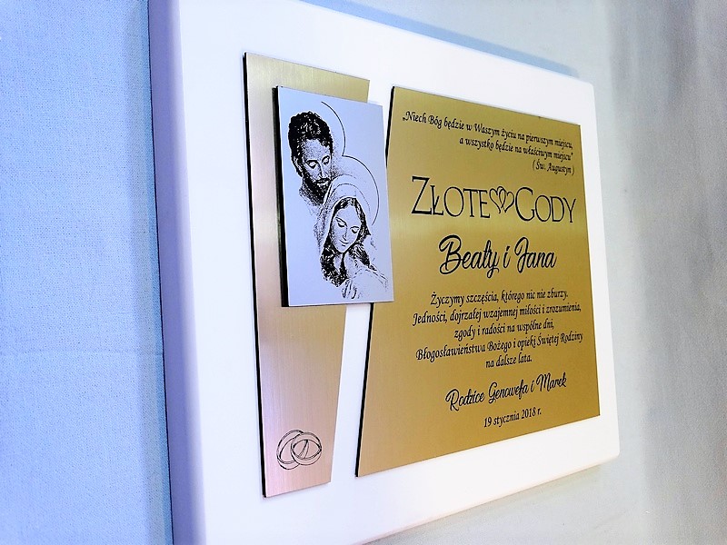 Dedykacja, grafiki, zdjęcia oraz ozdobniki wykonane są.na osobnych, dopasowanych do siebie blachach lub laminatach.