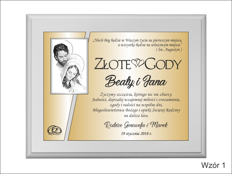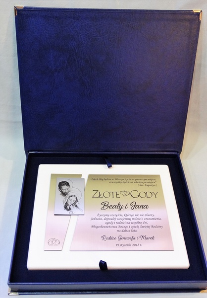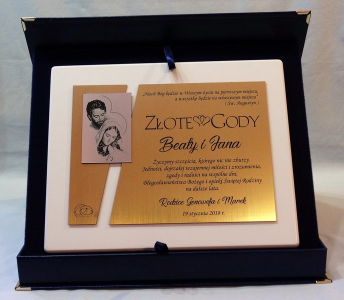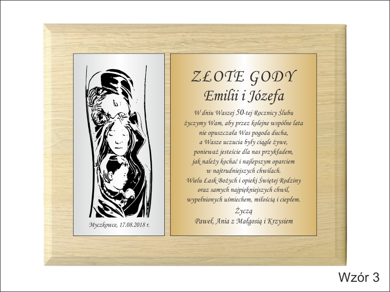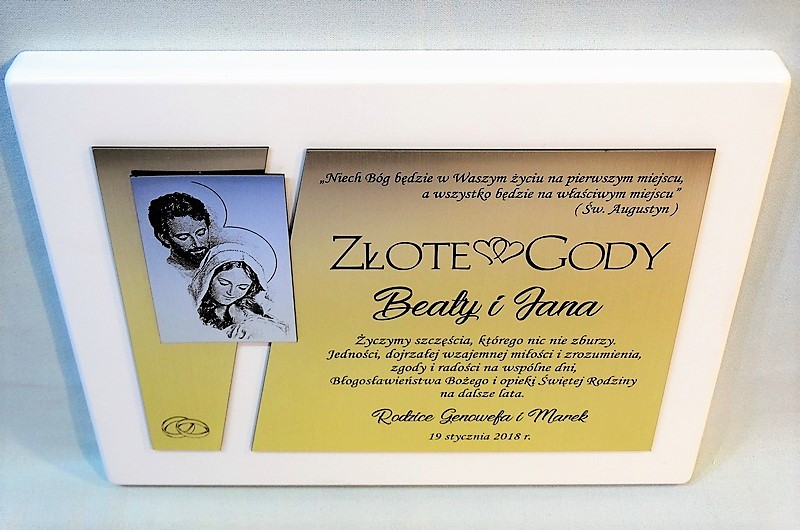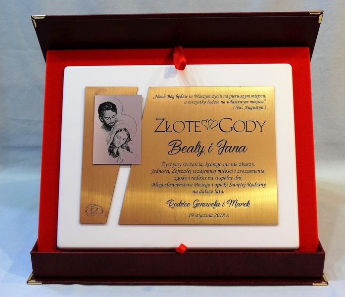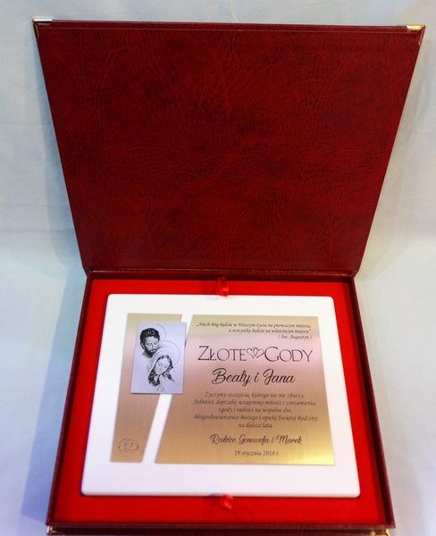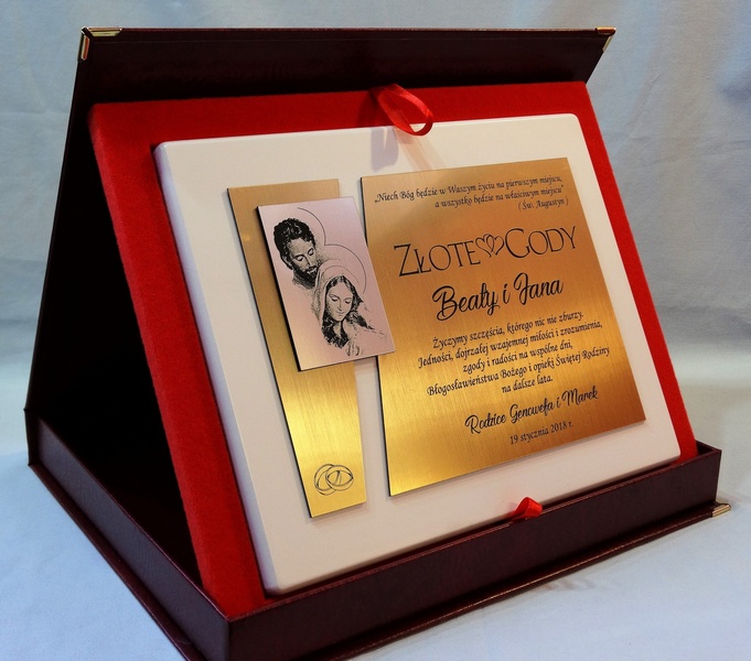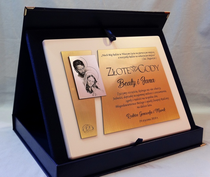 Dedykacja, grafiki, zdjęcia oraz ozdobniki wykonane są.na osobnych, dopasowanych do siebie blachach lub laminatach.