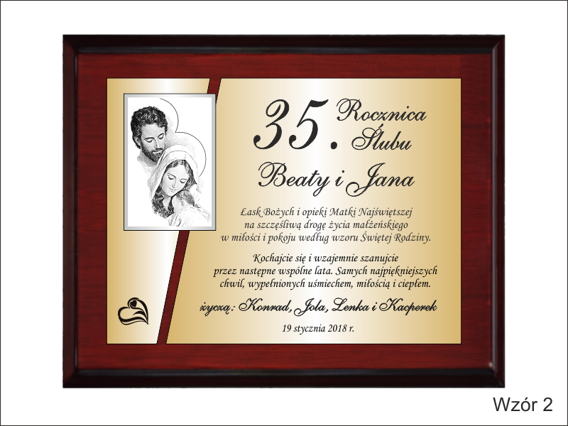 Pamiątkowy okolicznościowy dyplom drewniany z okazji Rocznicy Ślubu na drewnianym lakierowanym podkładzie.