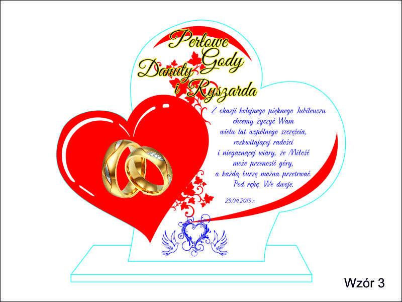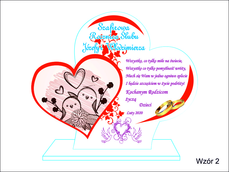 Upominek z okazji Roczniy Ślubu w postaci statuetki wykonanej z mlecznej pleksi w kształcie połączonych serc z nadrukiem dedykacji.