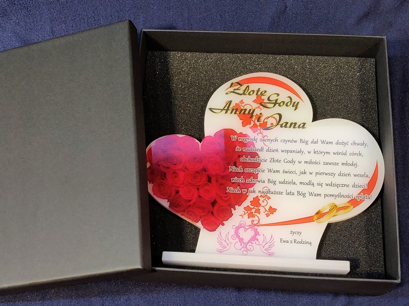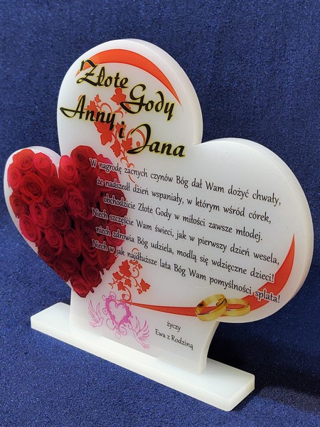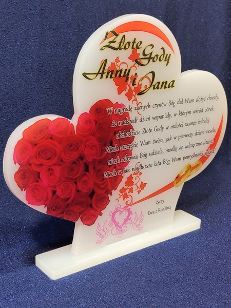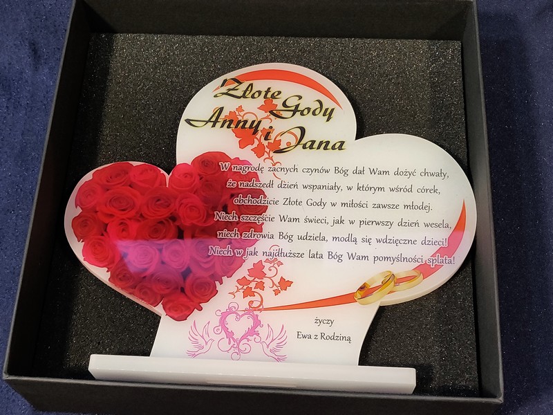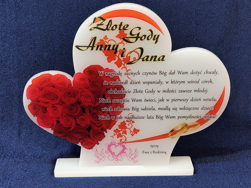Na pleksie wykonany jest bezpośredni nadruk dedykacji, ozdobnych grafik czy zdjęcia Jubilatów.