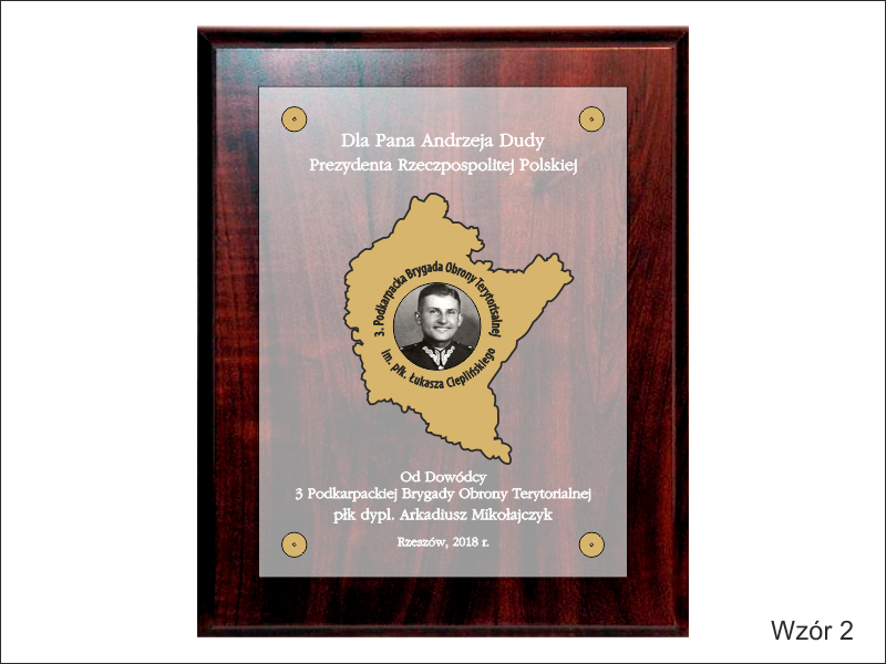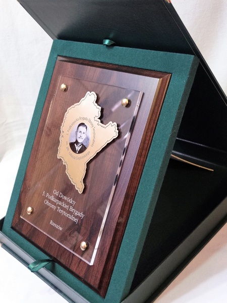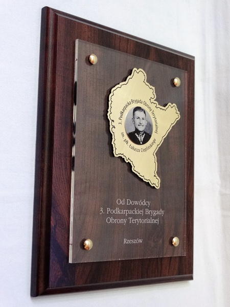 - z bezbarwnej pleksi z grawerem dedykacji oraz