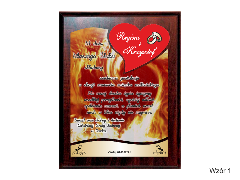 - białego laminatu grawerskiego z nadrukowaną dedykacją oraz motywem ognistego serca,