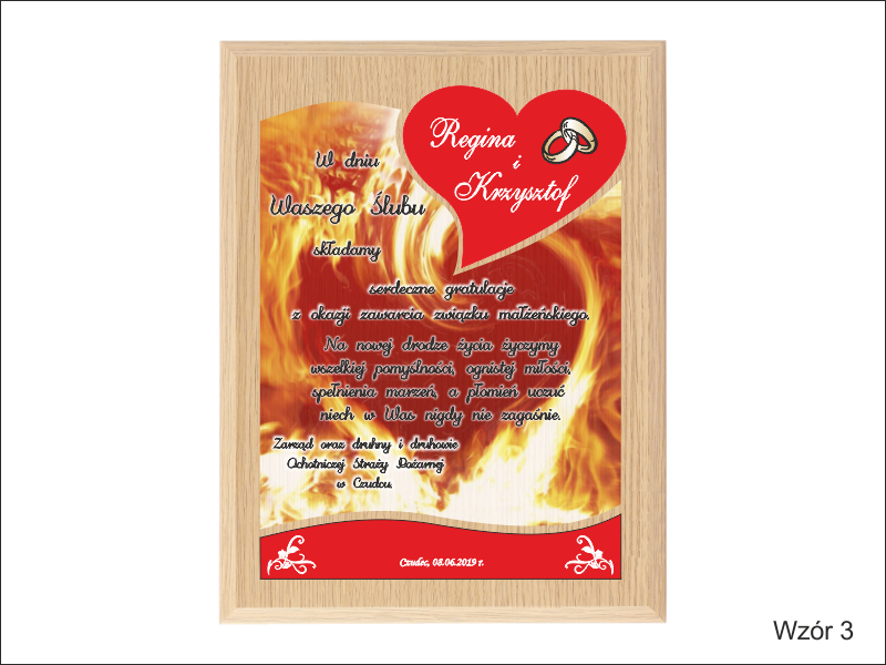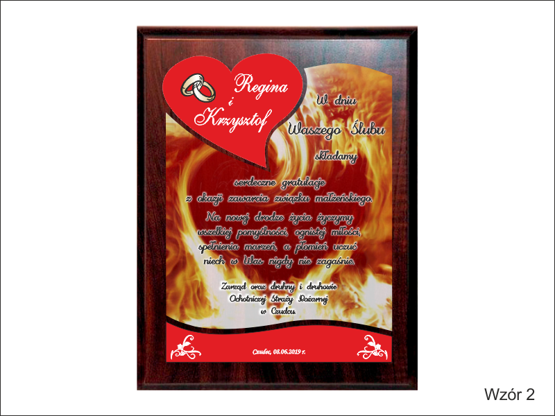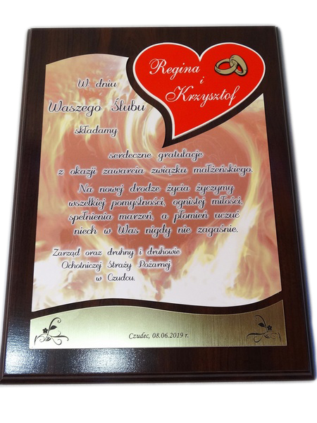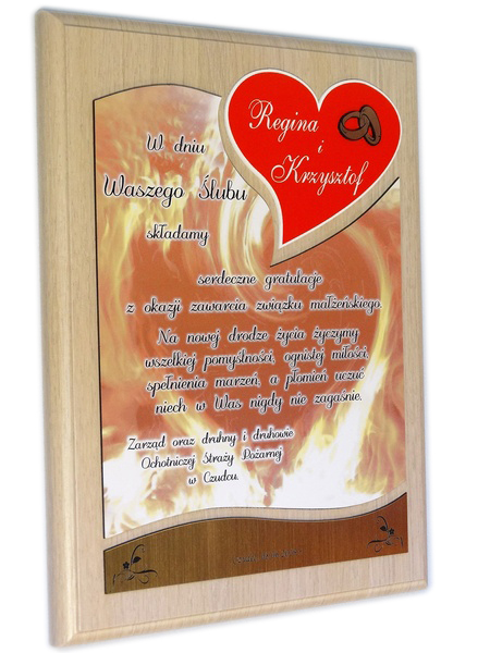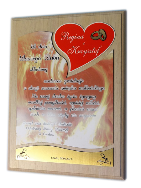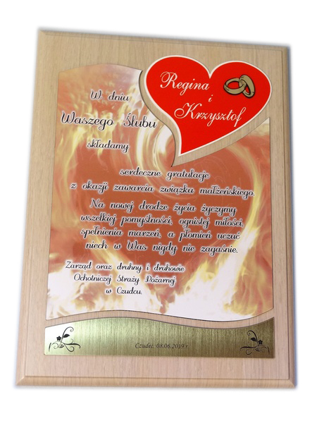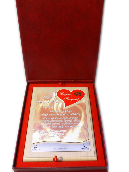 Okolicznościowy pamiątkowy dyplom z okazji ślubu na drewnianym standardowym podkładzie.