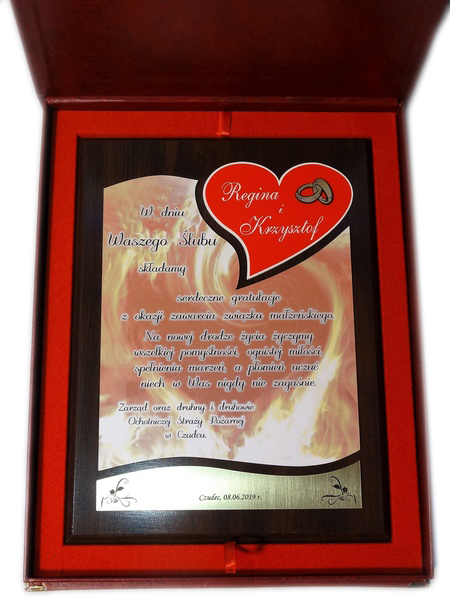Prezentowany dyplom dedykowany jest jako pamiątka ślubna od strażaków, ale może być także sprezentowany przez inne osoby.