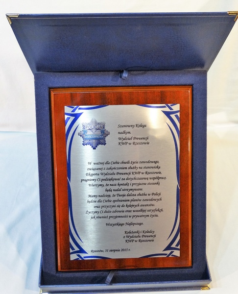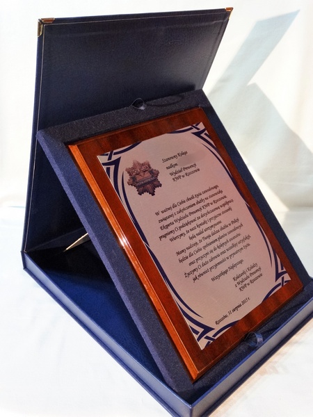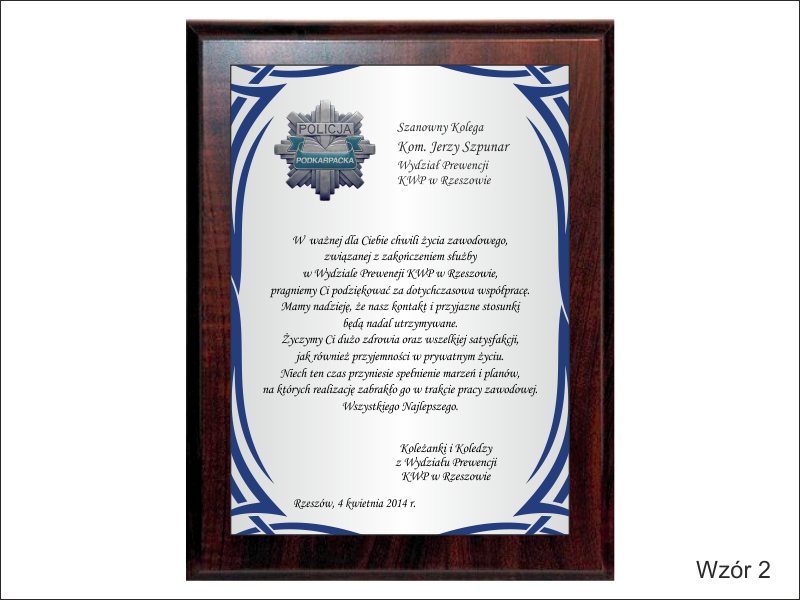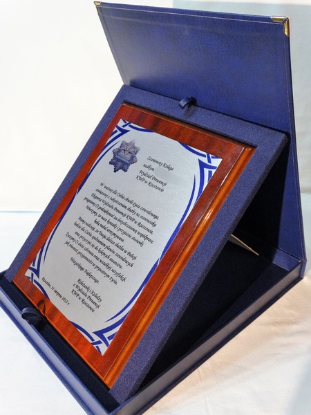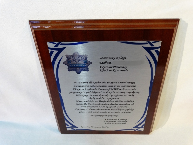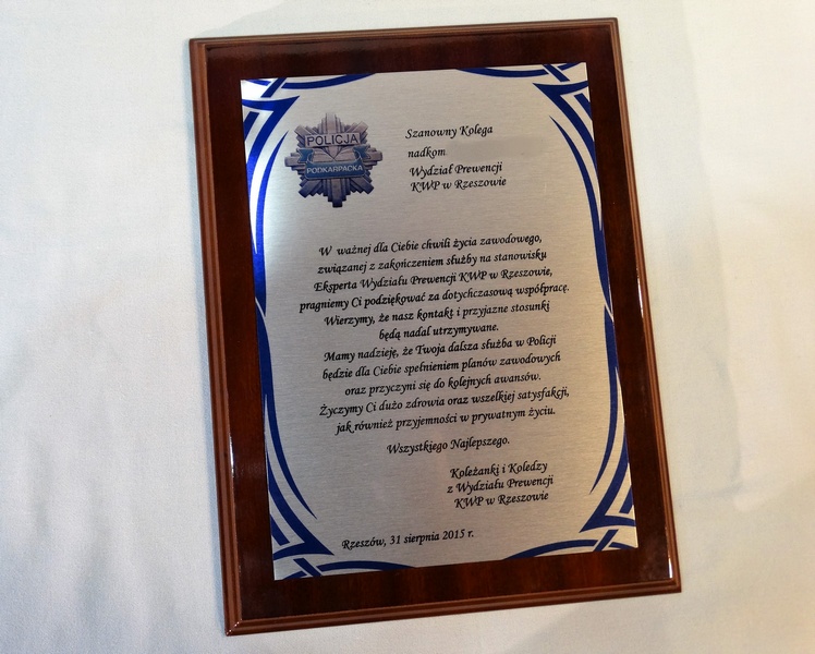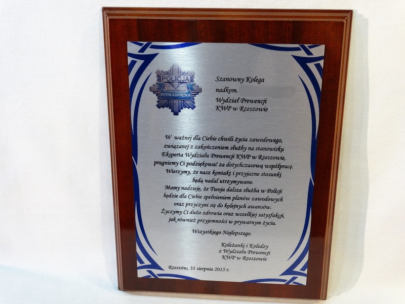 Pożegnalny, na pamiątkę i zakończenie wspólnej służby dyplom drewniany z blachą z nadrukiem na standardowym podkładzie