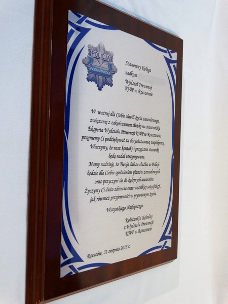 Prezentowany dyplom dedykowany jest jako pamiątka na zakończenie służby czy pożegnanie z pracy w policji, można wykonać go też na inną okoliczność.