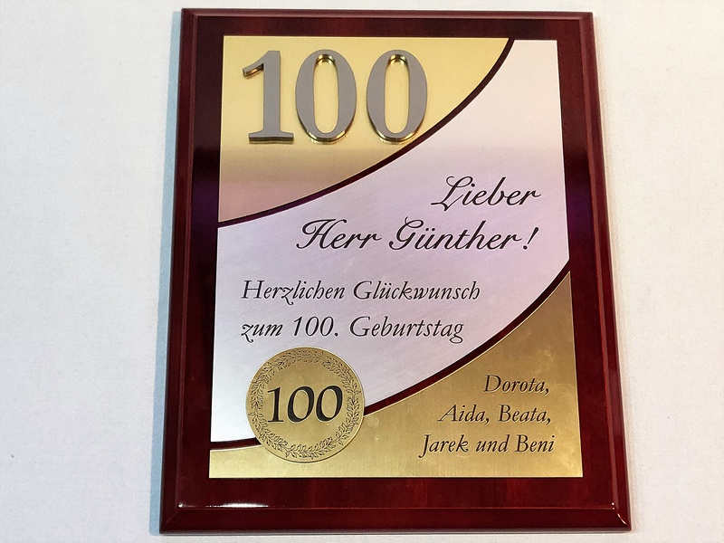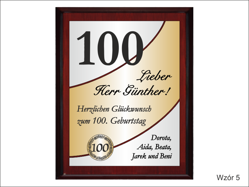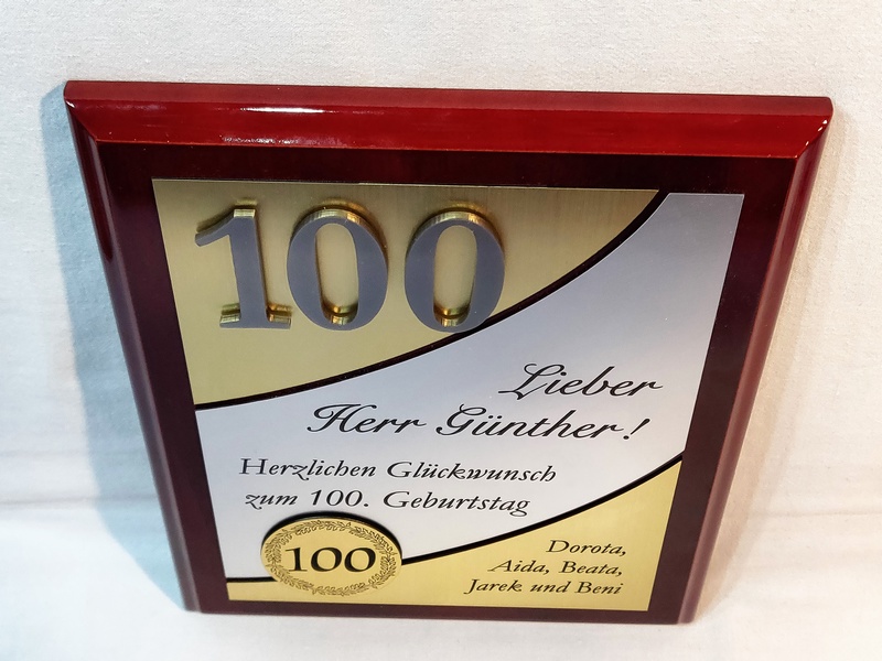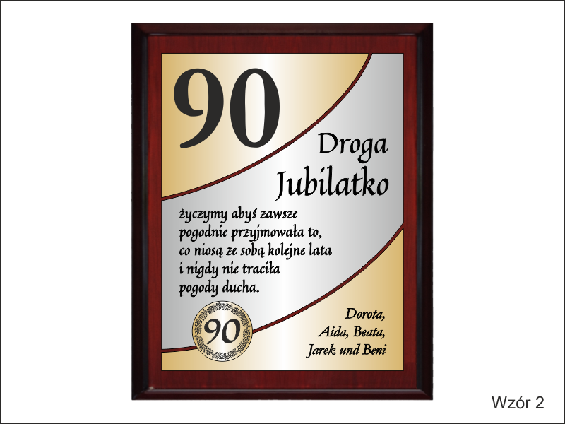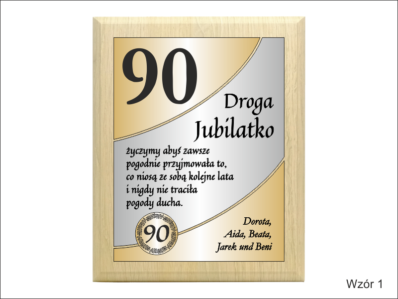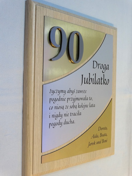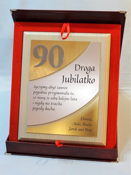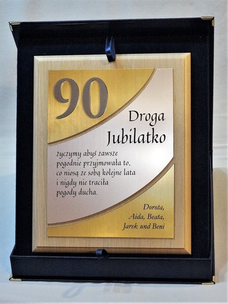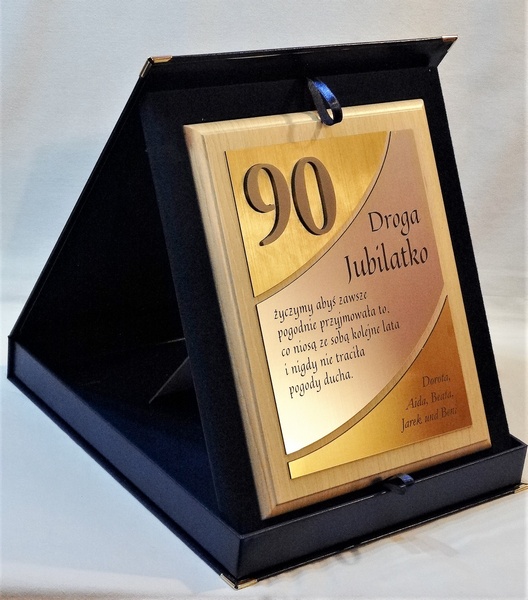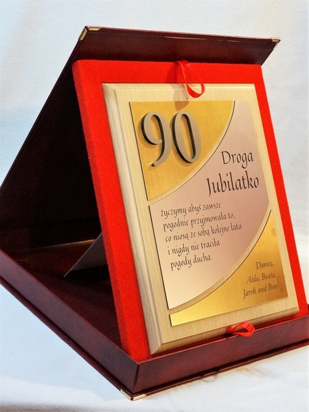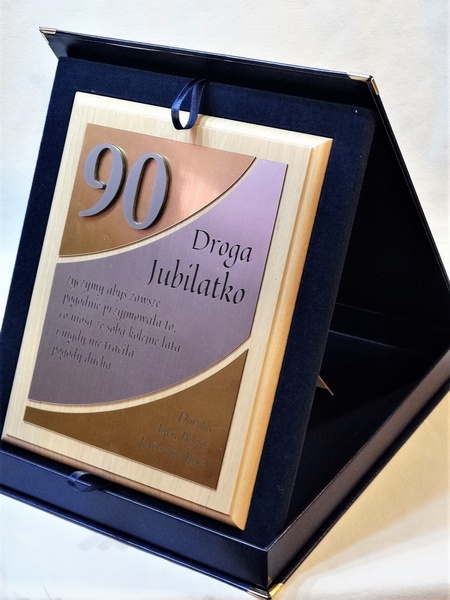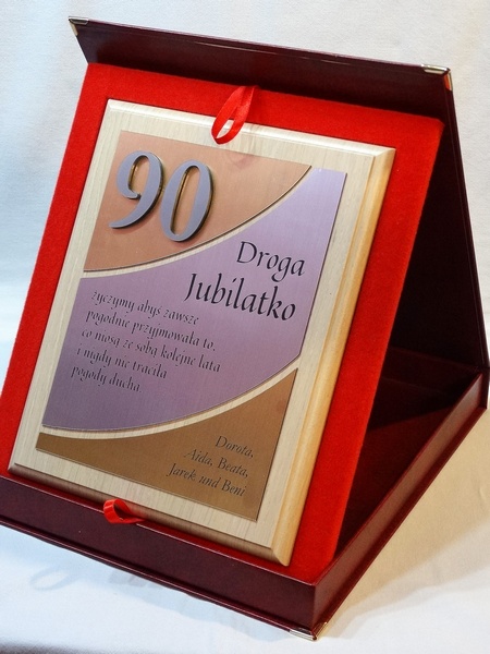 Upominek na jubileusz urodzin w postaci drewnianego dyplomu okolicznościowego lakierowanym podkładzie.