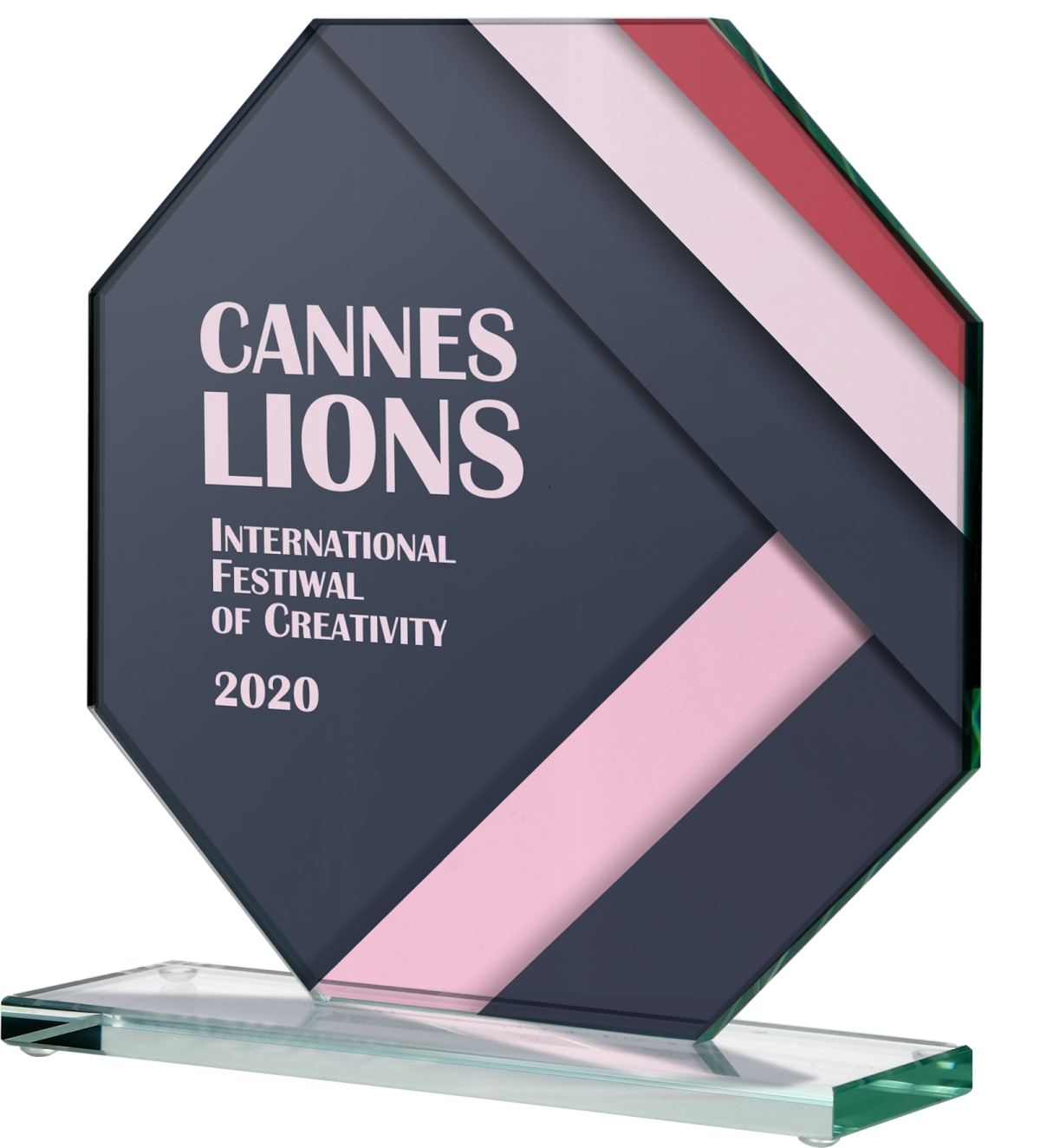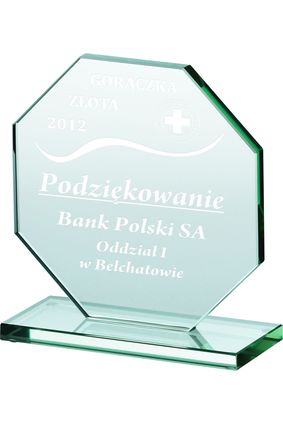 Statuetka szklana ma kształt ośmiokąta.