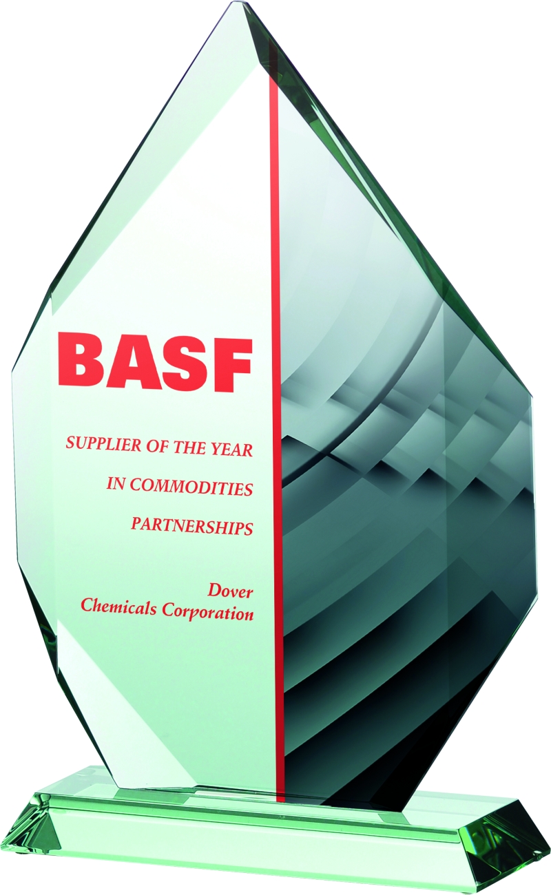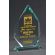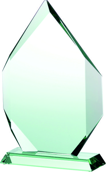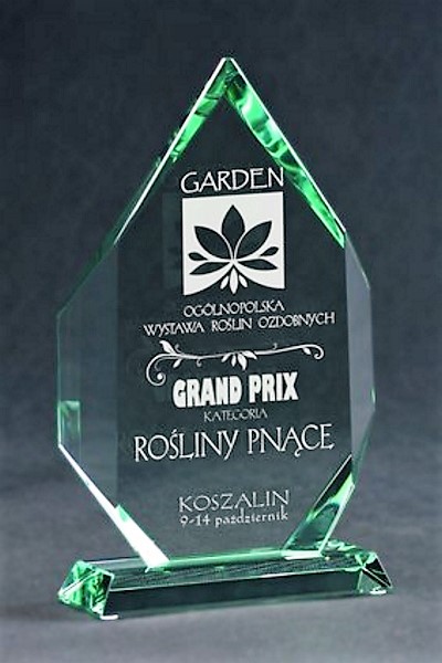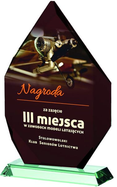 Statuetka szklana ma szlifowaną na krawędziach szklaną taflę.