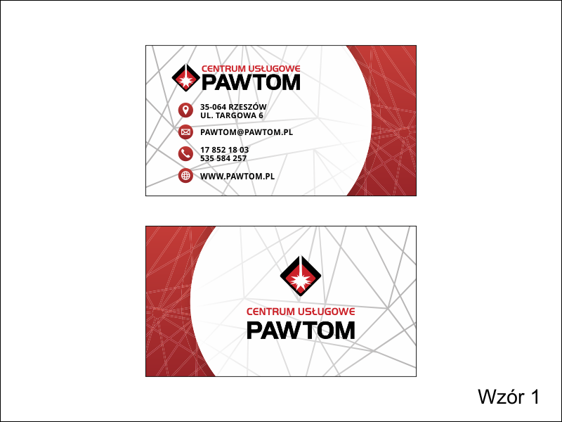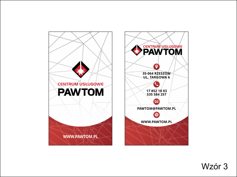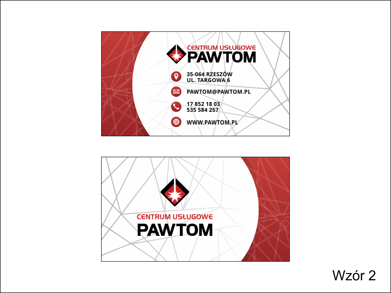 W projekcie wykorzystano podzielenie przestrzeni wizytówki na dwie różnokolorowe strefy biało-szarą i czerwoną.