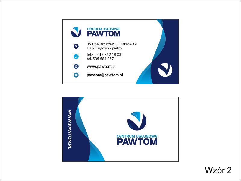 W projekcie wykorzystano podzielenie przestrzeni wizytówki na dwie różnokolorowe strefy białą i niebieską.