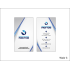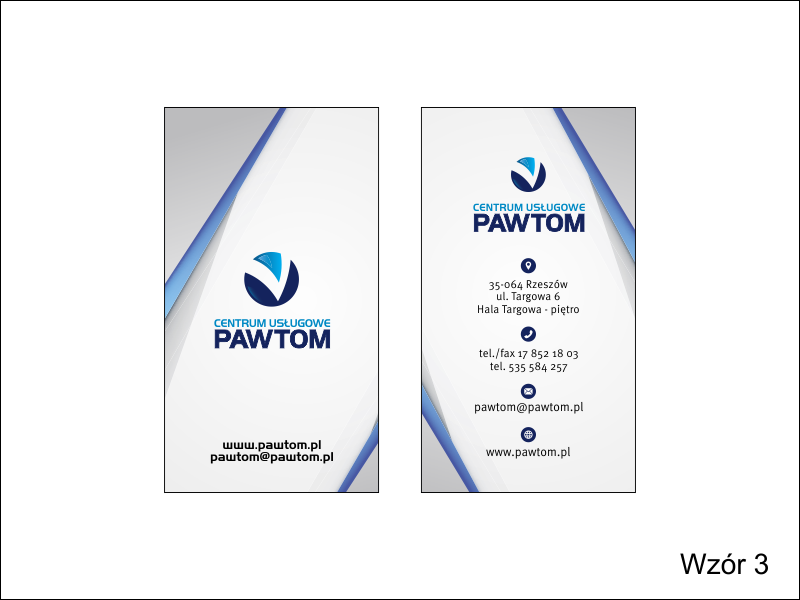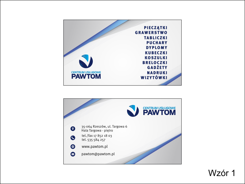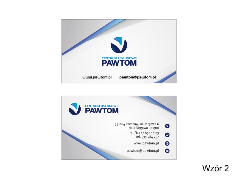 W projekcie wizytówki wykorzystano delikatne szare tło z niebieskimi akcentami w postaci skośnych, narożnych pasków.
