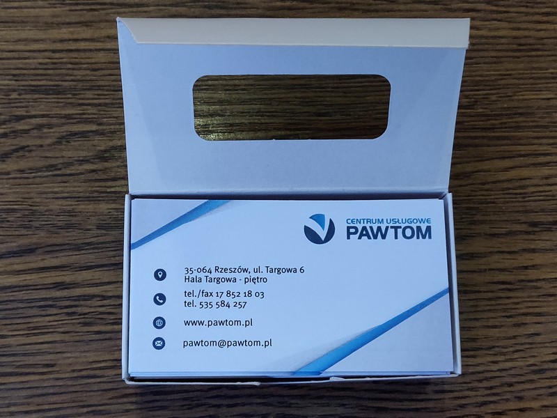 Gotowe wizytówki pakowane są w dedykowane kartonowe pudełko.