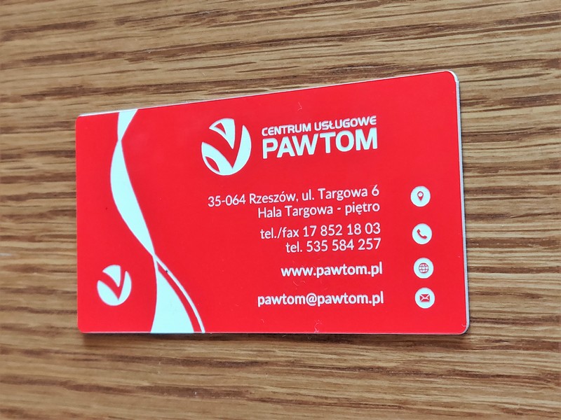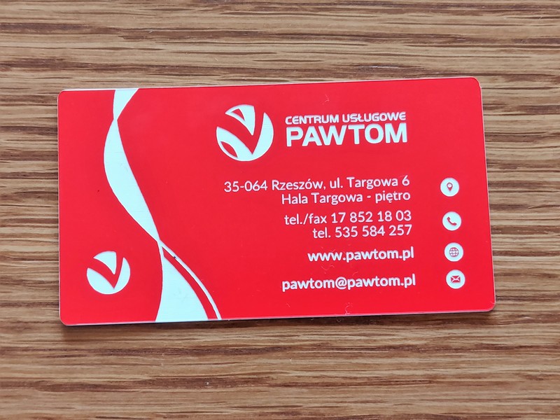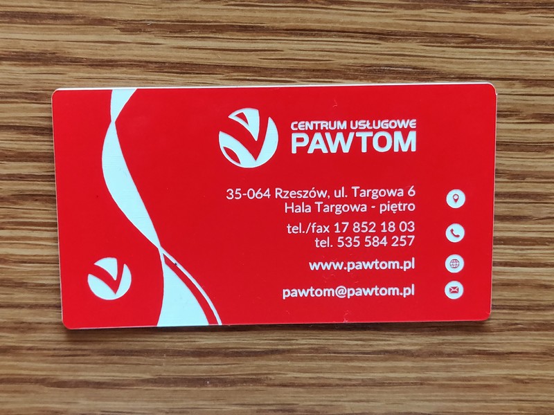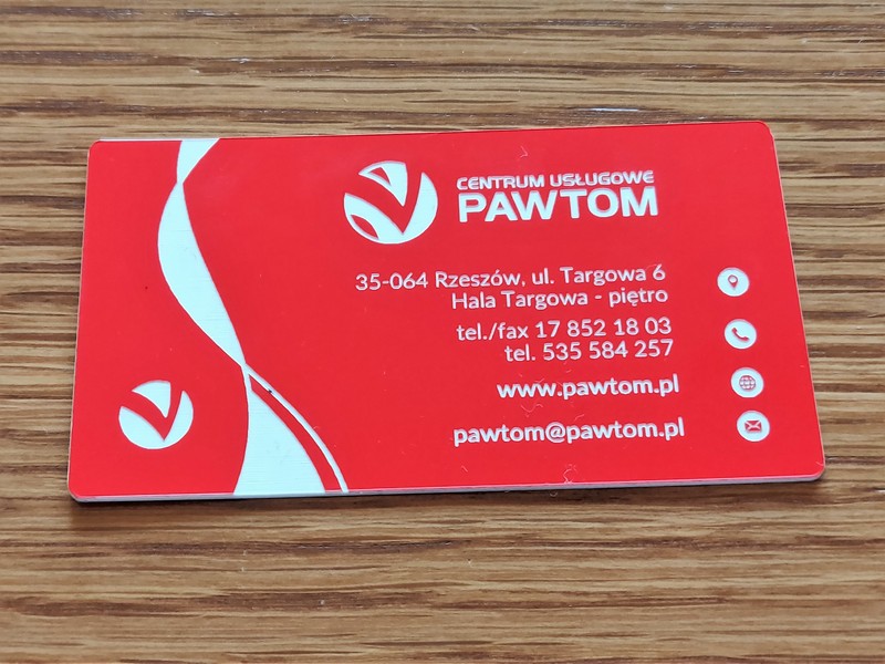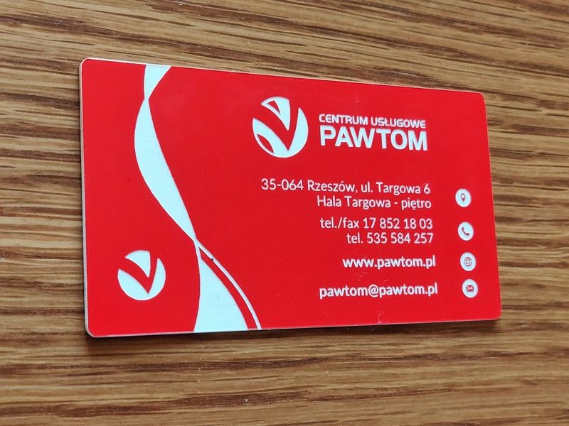 Poprzez zastosowanie zamiast papieru - laminatu, a zamiast nadruku - graweru, uzyskano wyjątkowe, usztywnione, trwałe wizytówki przypominające plastikowe karty.