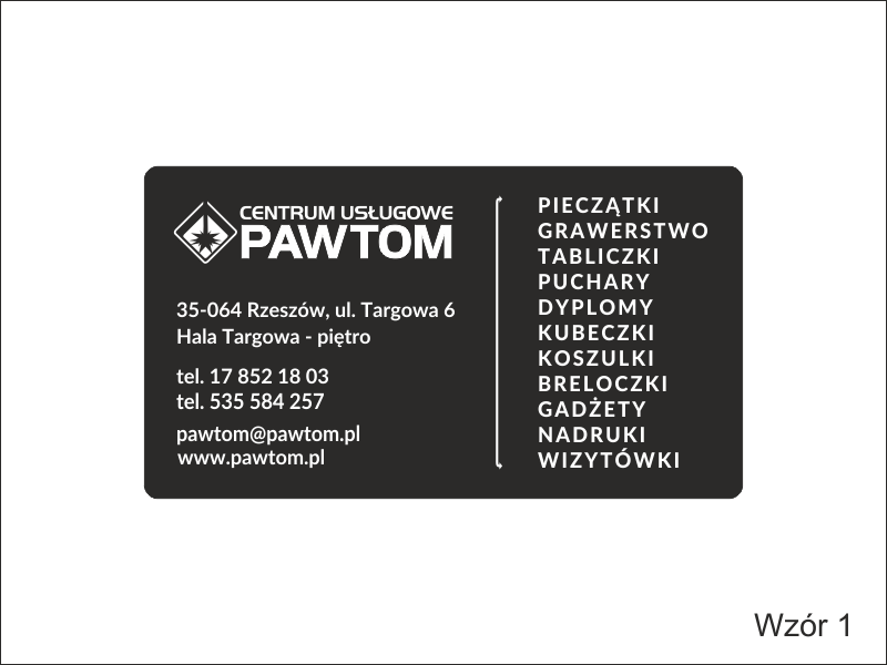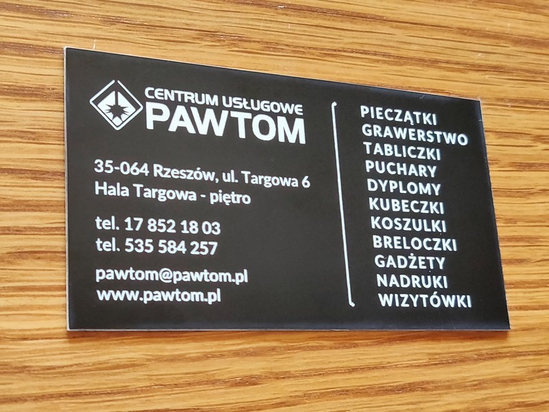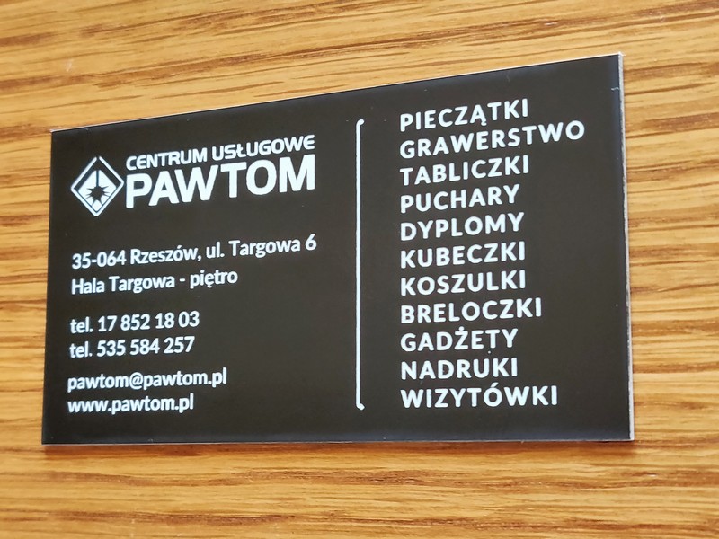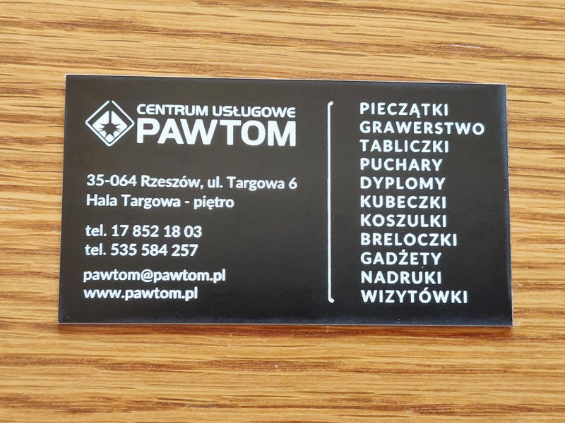 Wizytówki wykonane są z laminatu grawerskiego, grubości 0,8 mm.
