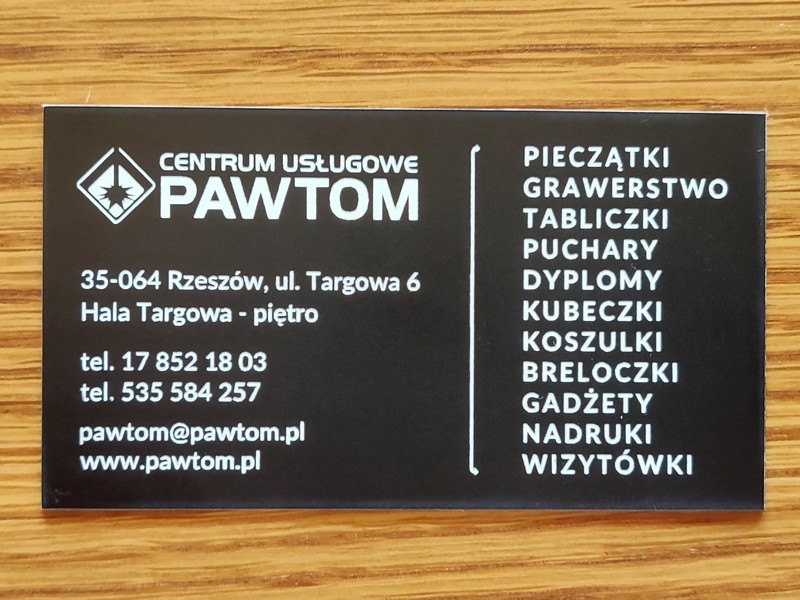 Poprzez zastosowanie zamiast papieru - laminatu, a zamiast nadruku - graweru, uzyskano wyjątkowe, usztywnione, trwałe wizytówki przypominające plastikowe karty.