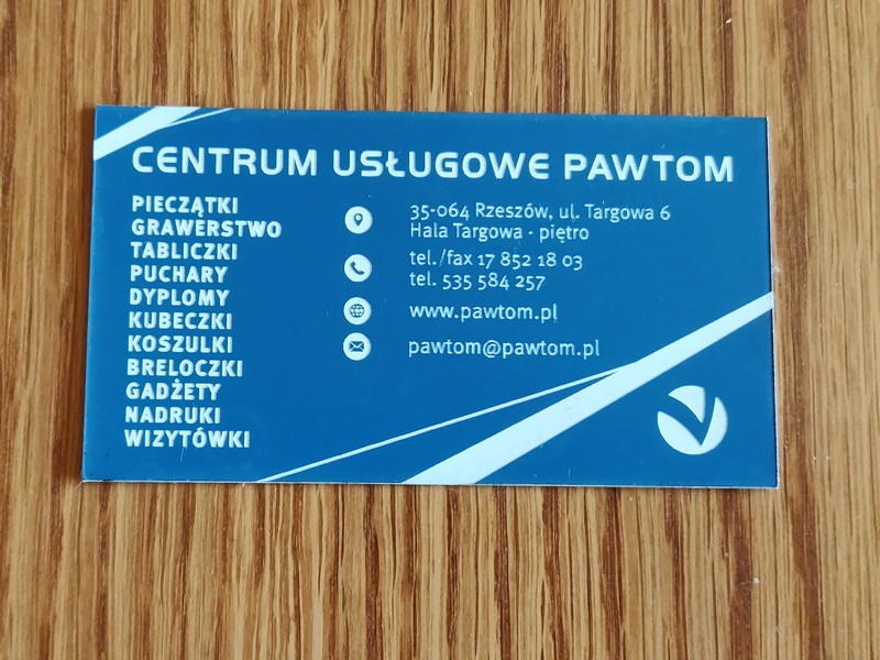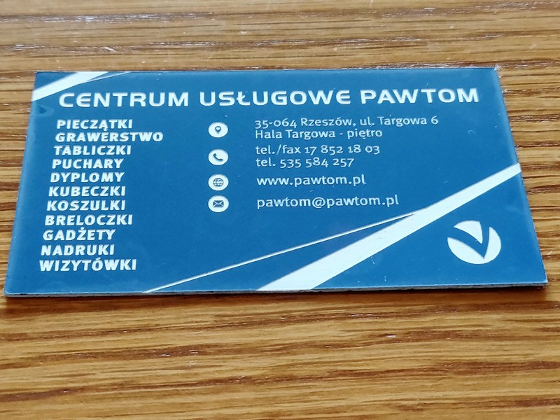 Poprzez zastosowanie zamiast papieru - laminatu, a zamiast nadruku - graweru, uzyskano wyjątkowe, usztywnione, trwałe wizytówki przypominające plastikowe karty.