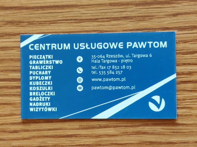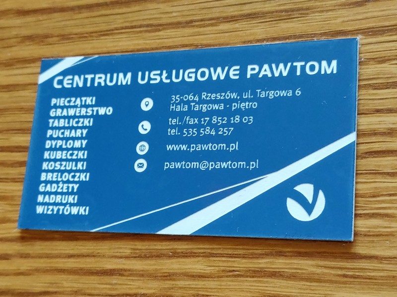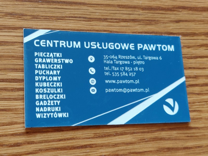 Wizytówki wykonane są z laminatu grawerskiego, grubości 0,8 mm.