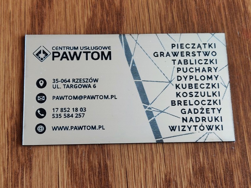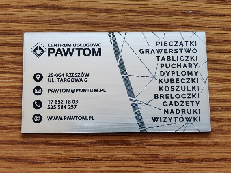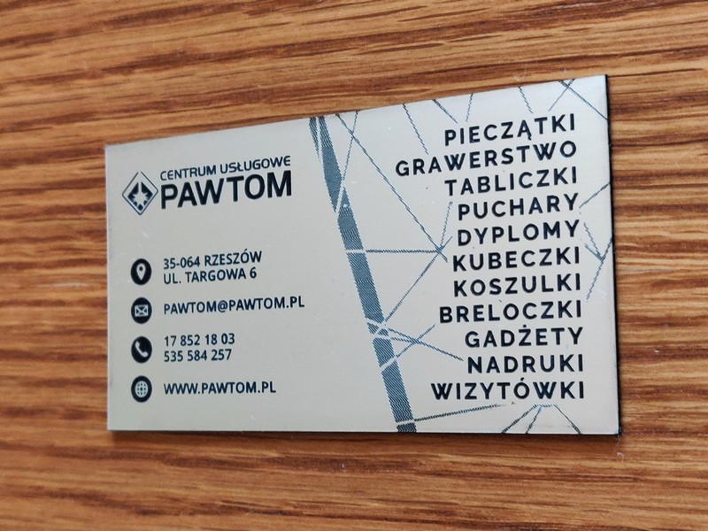 Poprzez zastosowanie zamiast papieru - laminatu, a zamiast nadruku - graweru, uzyskano wyjątkowe, usztywnione, trwałe wizytówki przypominające plastikowe karty.