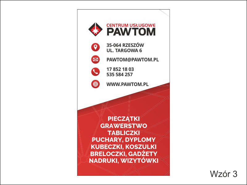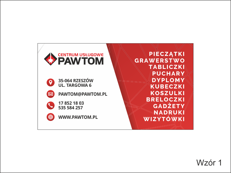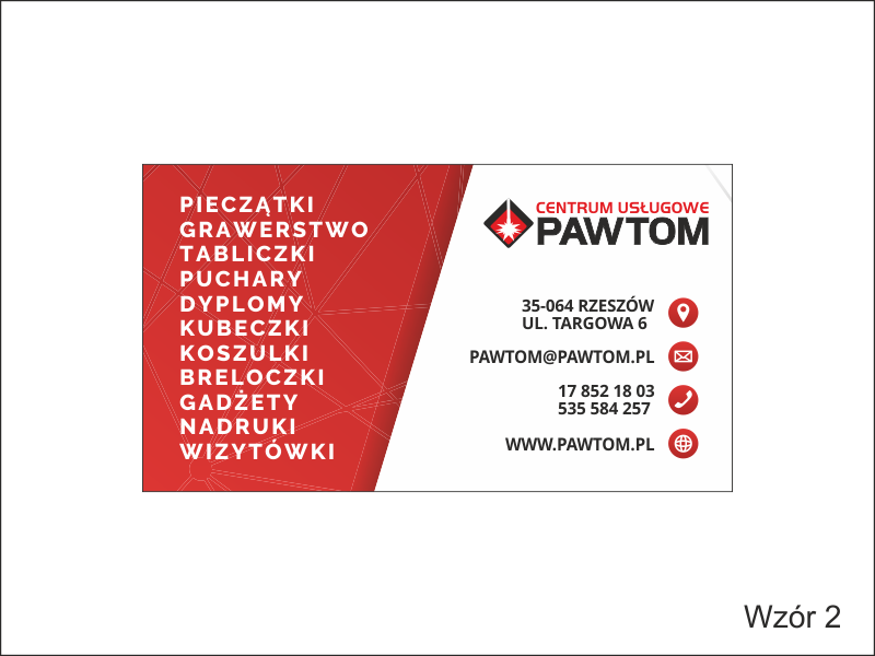 W projekcie wykorzystano podzielenie przestrzeni wizytówki na dwie różnokolorowe strefy białą i czerwoną.
