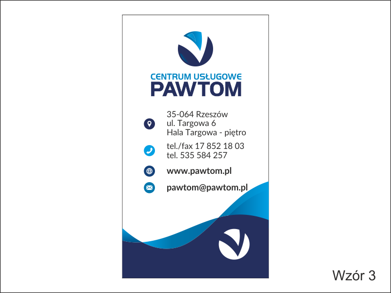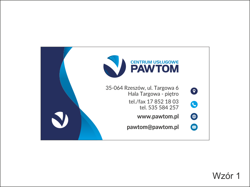 W projekcie wykorzystano podzielenie przestrzeni wizytówki na dwie różnokolorowe strefy białą i niebieską.