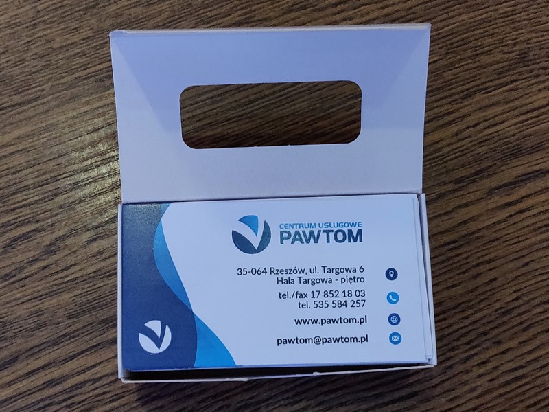 Gotowe wizytówki pakowane są w dedykowane kartonowe pudełko.