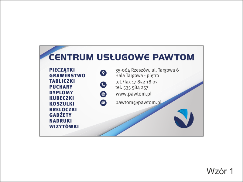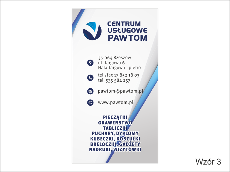 W projekcie wizytówki wykorzystano delikatne szare tło z niebieskimi akcentami w postaci skośnych, narożnych pasków.