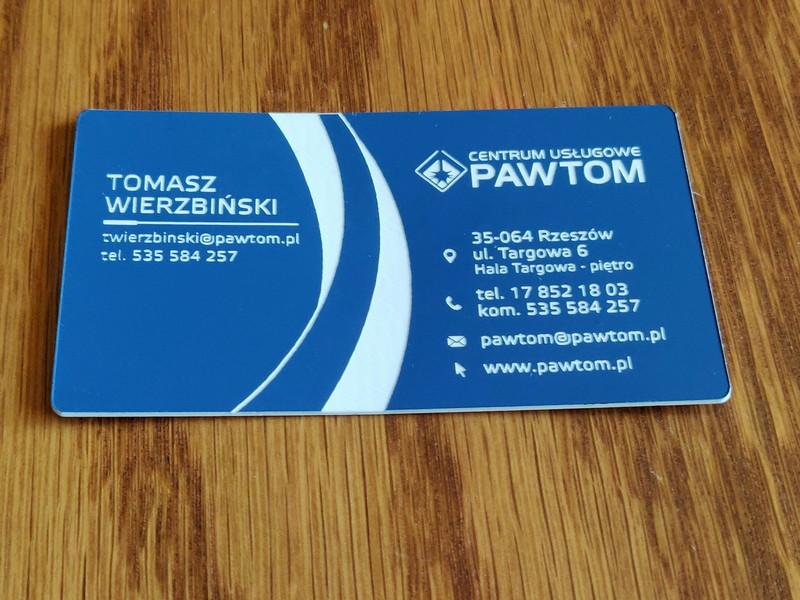 Wizytówki wykonane są z laminatu grawerskiego, grubości 0,8 mm.