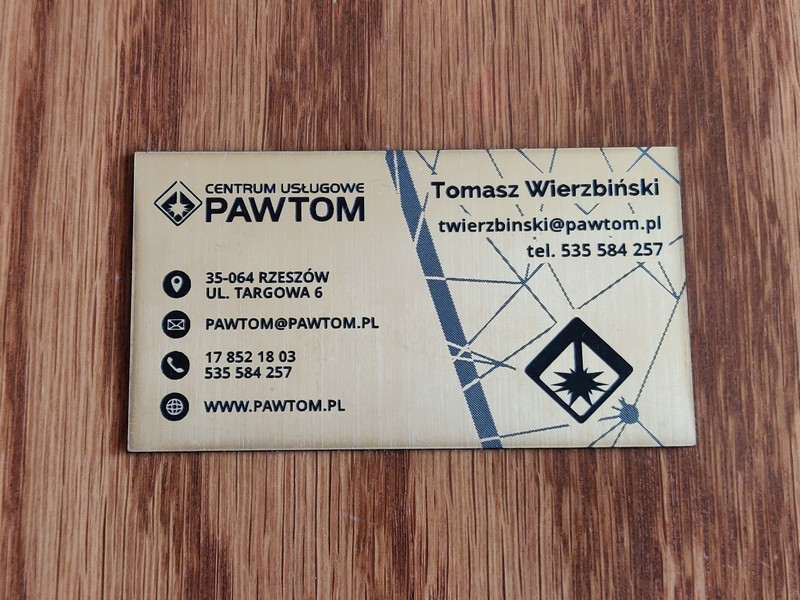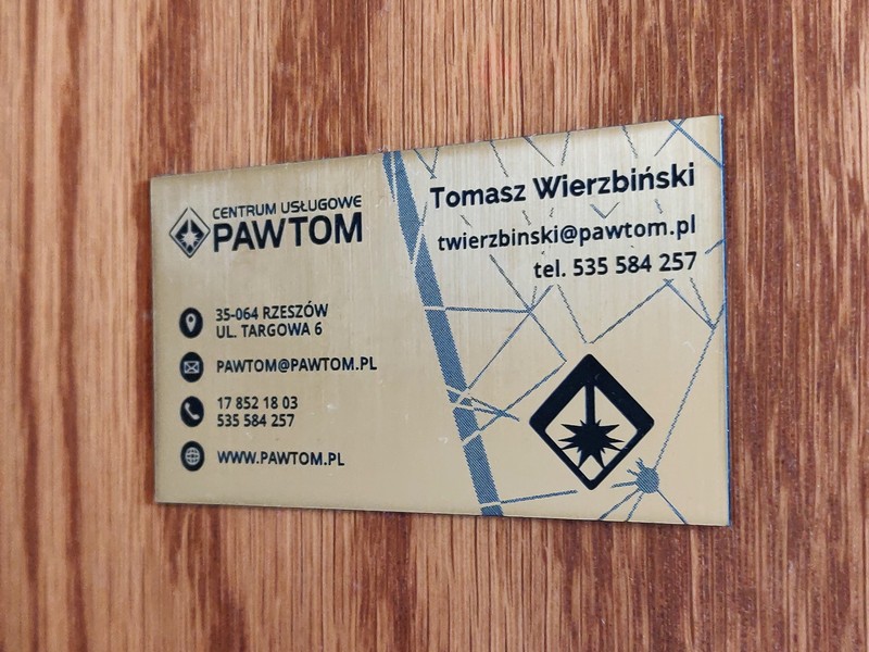 Poprzez zastosowanie zamiast papieru - laminatu, a zamiast nadruku - graweru, uzyskano wyjątkowe, usztywnione, trwałe wizytówki przypominające plastikowe karty.