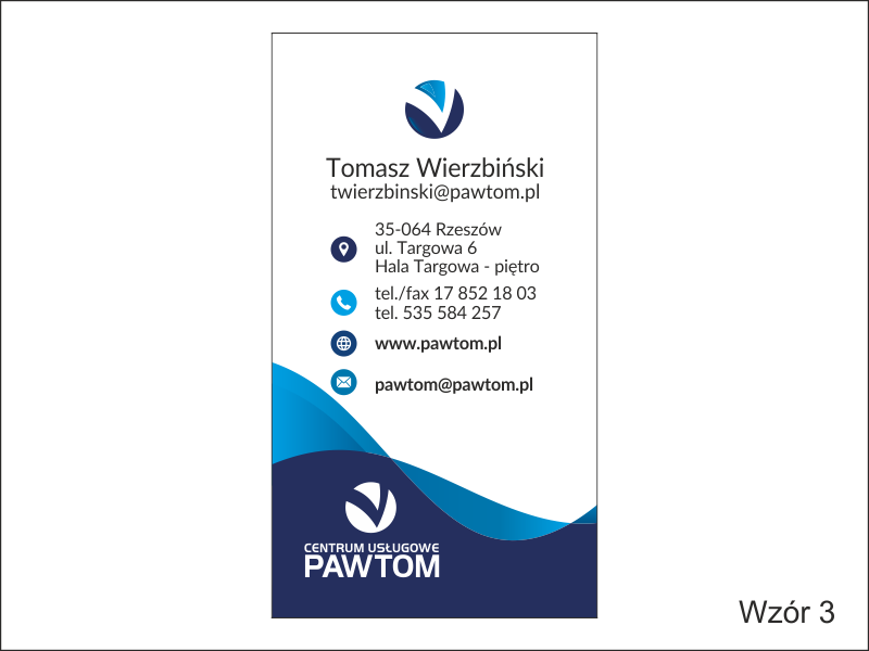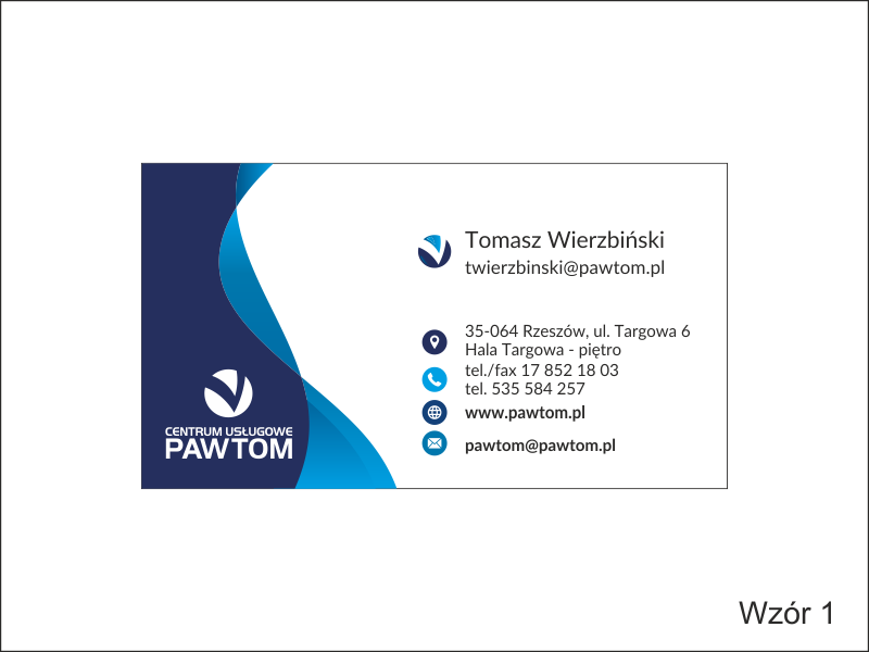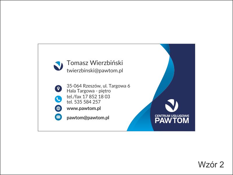 W projekcie wykorzystano podzielenie przestrzeni wizytówki na dwie różnokolorowe strefy białą i niebieską.